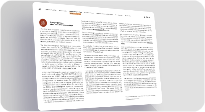 47 BMW Group Report 2024 To Our Stakeholders Combined Management Report Group Financial Statements Responsibility Statement and Auditor’s Report Remuneration Report Other Information Overview of the BMW Group Strategic approach – Where is the BMW Group heading?1 » The BMW Group consistently places the needs of its customers at the centre by combining forward-looking technologies, excit- ing products and personalised support into a comprehensive ex- perience. This allows the Company to meet a wide range of de- mands and expectations worldwide. The focus areas are drivetrains with an emphasis on electromobility as well as digi- talisation, sustainability and the circular economy. The BMW Group recognised the importance of electromobility early on. Since the end of 2023, the BMW Group has offered at least one all-electric model across all brands and segments. In 2024, the Group introduced several new vehicles to the market, including the BMW iX22, the extended-wheelbase version of the BMW i5 sedan tailored for the Chinese market, the BMW i5 Tour- ing2, the MINI Cooper SE2, the MINI Countryman SE2 and the all- electric MINI Aceman2, the brand’s first crossover model. Thanks to the attractive product portfolio, intelligent vehicle architectures and flexible production facilities, the number of deliveries in- creased to 426,536 fully electric vehicles in 2024, a rise of 13.5% (2023: 375,716 vehicles). ↗ Automotive Segment In 2025, the BMW Group also expects an increase in the deliver- ies of its fully electric vehicles. The NEUE KLASSE will enter pro- duction at the end of 2025. It will set benchmarks in electrifica- tion, digitalisation and circularity while maintaining BMW's typical driving pleasure and emotional design. The NEUE KLASSE is distinguished by its new cluster architecture (NCAR) exclusively focused on Battery Electric Vehicles (BEVs). The sixth-genera- tion BMW e-drive technology will significantly improve range, charging time and manufacturing costs. Inside, the next genera- tion of the BMW iDrive will provide a completely new digital user experience: Key elements include the BMW Panoramic Vision, a revolutionary new head-up technology, the new BMW 3D Head- up Display for presenting 3D animated and highly precise driving information, the multifunctional steering wheel for individual con- trol of display content and the central display with intuitive touch functionality. Furthermore, the NEUE KLASSE aims for a higher level of sustainability throughout the entire vehicle life cycle. To accomplish this, the BMW Group is increasingly integrating sec- ondary materials and implementing more resource-efficient pro- duction methods. ↗ Circular Economy and Resource Use The new technologies, modules and sustainability approaches that are built into the NEUE KLASSE will be rolled out across the entire vehicle portfolio by the end of the decade. We are also con- tinuously developing our combustion technology so that we can continue to offer customers state-of-the-art vehicles in all seg- ments in the future, independent of the drive system. The production of vehicles from the NEUE KLASSE will com- mence at the newly established BMW Group plant in Debrecen at the end of 2025 and will subsequently be expanded to addi- tional locations. ↗ Production Network The increase in customer demand for fully electric vehicles is de- pendent on the societal acceptance of electromobility and the development of the framework conditions, particularly the ex- pansion of infrastructure, the evolution of energy costs and the respective regional regulations. The BMW Group plans for a share of fully electric vehicles to exceed 50% by the year 2030. ↗ Innovations and Product Technologies Hydrogen fuel cell technology has the potential to serve as an- other all-electric pillar in our drive portfolio, in addition to battery electric drives. The BMW Group plans to launch its first series- produced BMW fuel cell electric vehicle (FCEV) in 2028. In order to develop this new generation of fuel cell drive technology, the BMW Group and the Toyota Motor Corporation are expanding their close, ten-year-plus partnership and combining their tech- nological expertise and innovative strength. The result of this col- laboration will be a jointly developed fuel cell drive system used in individual BMW and Toyota FCEV models. Working with Toyota in the development and procurement process will create synergies and scale effects that reduce the cost of the fuel cell technology. Furthermore, both companies continue to advocate for governments and investors to create suitable framework con- ditions for the early adoption of hydrogen mobility and are col- laborating with companies that establish low-emission facilities for hydrogen production, distribution and refuelling. With the market launch of the BMW CE 04 electric scooter in March 2022, BMW Motorrad has also successfully established itself in electromobility. Building on this success, the eParkourer – the BMW CE 02 – was introduced in April 2024 and will con- tinue the electrification strategy for urban mobility. ↗ Motorcycles Segment In addition to delivering product substance, we also offer custom- ers a 360˚ approach with an appropriate charging ecosystem. Beyond providing charging options at home and in the work- place, we are focusing on public charging with our BMW Charg- ing and MINI Charging offerings and are actively participating in the expansion of charging infrastructure in the most significant markets worldwide. Since 2017, the BMW Group has been strengthening the development of the European fast-charging network through its joint venture with IONITY. The BMW Group and six other automobile manufacturers founded the US joint venture IONNA in 2023 with the objective of strengthening the North American fast-charging network by installing 30,000 charging points. In China, the BMW Group, together with Mer- cedes-Benz, founded the joint venture IONCH