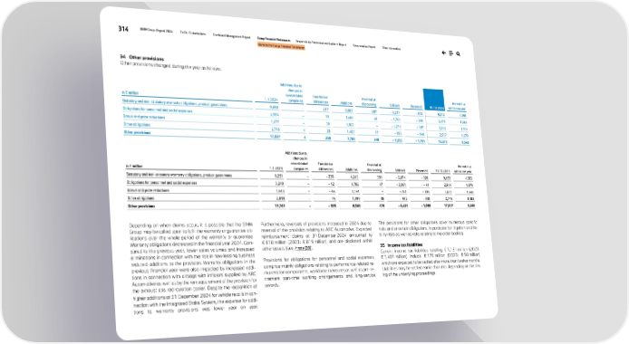 314 BMW Group Report 2024 To Our Stakeholders Combined Management Report Group Financial Statements Responsibility Statement and Auditor’s Report Remuneration Report Other Information Notes to the Group Financial Statements 34 Other provisions Other provisions changed during the year as follows: in € million 1.1.2024 Additions due to changes in consolidated companies Translation differences Additions Reversal of discounting Utilised Reversed 31.12.2024 thereof due within one year Statutory and non-statutory warranty obligations, product guarantees 9,650 – 217 3,007 287 – 3,217 – 672 9,272 3,595 Obligations for personnel and social expenses 2,964 – 15 1,464 44 – 1,763 – 246 2,478 1,664 Bonus and price reductions 1,677 – 30 1,822 – – 1,276 – 187 2,066 1,914 Other obligations 2,746 4 28 1,407 17 – 999 – 646 2,557 1,370 Other provisions 17,037 4 290 7,700 348 – 7,255 – 1,751 16,373 8,543 in € million 1.1.2023 Additions due to changes in consolidated companies Translation differences Additions Reversal of discounting Utilised Reversed 31.12.2023 thereof due within one year Statutory and non-statutory warranty obligations, product guarantees 8,251 – – 235 4,243 391 – 2,674 – 326 9,650 4,333 Obligations for personnel and social expenses 3,249 – – 12 1,782 47 – 2,061 – 41 2,964 1,979 Bonus and price reductions 1,443 – – 44 1,144 – – 761 – 105 1,677 1,545 Other obligations 2,818 – – 44 1,399 38 – 932 – 533 2,746 1,383 Other provisions 15,761 – – 335 8,568 476 – 6,428 – 1,005 17,037 9,240 Depending on when claims occur, it is possible that the BMW Group may be called upon to fulfil the warranty or guarantee ob- ligations over the whole period of the warranty or guarantee. Warranty obligations decreased in the financial year 2024. Com- pared to the previous year, lower sales volumes and increased eliminations in connection with the rise in new leasing business reduced additions to the provision. Warranty obligations in the previous financial year were also impacted by increased addi- tions in connection with airbags with inflators supplied by ARC Automotive as well as by the remeasurement of the provision for the exhaust gas recirculation cooler. Despite the recognition of higher additions at 31 December 2024 for vehicle recalls in con- nection with the Integrated Brake System, the expense for addi- tions to warranty provisions was lower year on year. Furthermore, reversals of provisions increased in 2024 due to reversal of the provision relating to ARC Automotive. Expected reimbursement claims at 31 December 2024 amounted to € 818 million (2023: € 819 million) and are disclosed within other assets (see ↗ note [28]). Provisions for obligations for personnel and social expenses comprise mainly obligations relating to performance-related re- muneration components, workforce measures as well as pre-re- tirement part-time working arrangements and long-service awards. The provisions for other obligations cover numerous specific risks and uncertain obligations, in particular for litigation and lia- bility risks as well as risks relating to the order backlog. 35 Income tax liabilities Current income tax liabilities totalling € 1,131 million (2023: € 1,401 million) include € 170 million (2023: € 50 million) which are expected to be settled after more than twelve months. Liabilities may be settled earlier than this depending on the tim- ing of the underlying proceedings.