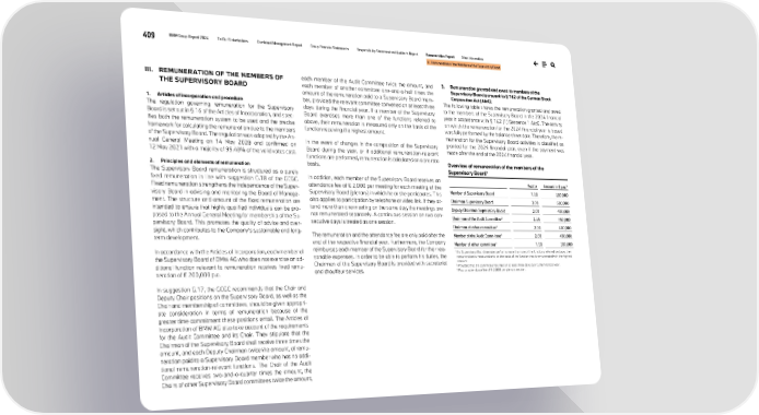 409 BMW Group Report 2024 To Our Stakeholders Combined Management Report Group Financial Statements Responsibility Statement and Auditor’s Report Remuneration Report Other Information III. Remuneration of the Members of the Supervisory Board III. REMUNERATION OF THE MEMBERS OF THE SUPERVISORY BOARD 1. Articles of incorporation and procedure The regulation governing remuneration for the Supervisory Board is set out in § 16 of the Articles of Incorporation, and spec- ifies both the remuneration system to be used and the precise framework for calculating the remuneration due to the members of the Supervisory Board. The regulation was adopted by the An- nual General Meeting on 14 May 2020 and confirmed on 12 May 2021 with a majority of 99.40% of the valid votes cast. 2. Principles and elements of remuneration The Supervisory Board remuneration is structured as a purely fixed remuneration in line with suggestion G.18 of the GCGC. Fixed remuneration strengthens the independence of the Super- visory Board in advising and monitoring the Board of Manage- ment. The structure and amount of the fixed remuneration are intended to ensure that highly qualified individuals can be pro- posed to the Annual General Meeting for membership of the Su- pervisory Board. This promotes the quality of advice and over- sight, which contributes to the Company’s sustainable and long- term development. In accordance with the Articles of Incorporation, each member of the Supervisory Board of BMW AG who does not exercise an ad- ditional function relevant to remuneration receives fixed remu- neration of € 200,000 p.a. In suggestion G.17, the GCGC recommends that the Chair and Deputy Chair positions on the Supervisory Board, as well as the Chair and membership of committees, should be given appropri- ate consideration in terms of remuneration because of the greater time commitment these positions entail. The Articles of Incorporation of BMW AG also take account of the requirements for the Audit Committee and its Chair. They stipulate that the Chairman of the Supervisory Board shall receive three times the amount, and each Deputy Chairman twice the amount, of remu- neration paid to a Supervisory Board member who has no addi- tional remuneration-relevant functions. The Chair of the Audit Committee receives two-and-a-quarter times the amount, the Chairs of other Supervisory Board committees twice the amount, each member of the Audit Committee twice the amount, and each member of another committee one-and-a-half times the amount of the remuneration paid to a Supervisory Board mem- ber, provided the relevant committee convened on at least three days during the financial year. If a member of the Supervisory Board exercises more than one of the functions referred to above, their remuneration is measured only on the basis of the function receiving the highest amount. In the event of changes in the composition of the Supervisory Board during the year, or if additional remuneration-relevant functions are performed, remuneration is calculated on a pro rata basis. In addition, each member of the Supervisory Board receives an attendance fee of € 2,000 per meeting for each meeting of the Supervisory Board (plenary) in which he or she participates. This also applies to participation by telephone or video link. If they at- tend more than one meeting on the same day, the meetings are not remunerated separately. A continuous session on two con- secutive days is treated as one session. The remuneration and the attendance fee are only paid after the end of the respective financial year. Furthermore, the Company reimburses each member of the Supervisory Board for their rea- sonable expenses. In order to be able to perform his duties, the Chairman of the Supervisory Board is provided with secretariat and chauffeur services. 3. Remuneration granted and owed to members of the Supervisory Board pursuant to § 162 of the German Stock Corporation Act (AktG) The following table shows the remuneration granted and owed to the members of the Supervisory Board in the 2024 financial year in accordance with § 162 (1) Sentence 1 AktG. The activity on which the remuneration for the 2024 financial year is based was fully performed by the balance sheet date. Therefore, the re- muneration for the Supervisory Board activities is classified as granted for the 2024 financial year, even if the payment was made after the end of the 2024 financial year. Overview of remuneration of the members of the Supervisory Board¹ Factor Amount in € p.a.3 Member of Supervisory Board 1.00 200,000 Chairman Supervisory Board 3.00 600,000 Deputy Chairman Supervisory Board 2.00 400,000 Chairman of the Audit Committee2 2.25 450,000 Chairman of other committee2 2.00 400,000 Member of the Audit Committee2 2.00 400,000 Member of other committee2 1.50 300,000 1 If a Supervisory Board member performs more than one of the functions referred to above, their remuneration is measured only on the basis of the function that is remunerated with the highest amount. 2 Provided that the committee has met on at least three days during the financial year. 3 Plus an attendance fee of € 2,000 per plenary session.