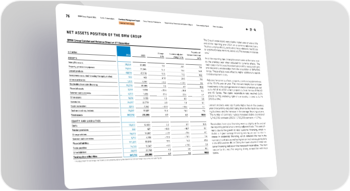 76 BMW Group Report 2024 To Our Stakeholders Combined Management Report Group Financial Statements Responsibility Statement and Auditor’s Report Remuneration Report Other Information Financial Performance NET ASSETS POSITION OF THE BMW GROUP BMW Group Condensed Balance Sheet at 31 December in € million 2024 2023 Change in % Currency-adjusted change* in % Proportion of balance sheet total in % A S S E T S Intangible assets 20,220 20,022 1.0 – 0.4 7.6 Property, plant and equipment 39,581 35,266 12.2 10.4 14.8 Leased products 48,838 43,118 13.3 11.2 18.2 Investments accounted for using the equity method 553 443 24.8 24.8 0.2 Other investments 1,099 1,197 – 8.2 – 12.0 0.4 Receivables from sales financing 93,718 87,355 7.3 4.7 35.0 Financial assets 3,399 5,518 – 38.4 – 39.1 1.3 Deferred and current tax 4,560 3,630 25.6 23.4 1.7 Other assets 9,256 9,133 1.3 0.8 3.5 Inventories 24,387 23,719 2.8 1.1 9.1 Trade receivables 2,834 4,162 – 31.9 – 33.2 1.1 Cash and cash equivalents 19,287 17,327 11.3 10.4 7.2 Total assets 267,732 250,890 6.7 4.8 100.0 E Q U I T Y A N D L I A B I L I T I E S Equity 95,003 92,923 2.2 0.7 35.5 Pension provisions 222 427 – 48.0 – 48.7 0.1 Other provisions 16,373 17,037 – 3.9 – 5.2 6.1 Deferred and current tax 3,752 4,198 – 10.6 – 10.9 1.4 Financial liabilities 111,261 95,010 17.1 14.3 41.6 Trade payables 14,126 15,547 – 9.1 – 10.6 5.3 Other liabilities 26,995 25,748 4.8 3.1 10.1 Total equity and liabilities 267,732 250,890 6.7 4.8 100.0 * The adjustment for exchange rate factors is calculated by applying the relevant current exchange rates to the prior-year figures. The Group’s total assets were slightly higher year on year at the end of the reporting year 2024 on a currency-adjusted basis. Positive currency effects, particularly those related to the US dol- lar and the Chinese renminbi, led to a 6.7% increase in total as- sets.* As at the reporting date, intangible assets were at the same level as the previous year when adjusted for currency effects. The main reason for this was the amortisation of the reacquired rights and dealership relationships from the acquisition of BMW Bril- liance. These effects were offset by higher additions to capital- ised development costs. Adjusted for currency effects, property, plant and equipment was up by 10.4% year on year. This rise was largely due to higher investments in the sixth generation of electric drivetrains, as well as for NEUE KLASSE vehicle projects such as the new BMW X3 and X5 Series. The capital expenditure ratio reached 6.4% (2023: 5.7%); excluding right-of-use assets, it stood at 5.7% (2023: 4.9%). Leased products were significantly higher than in the previous year on a currency-adjusted basis, driven by the rise in new leas- ing business and the increase in the average financing volume. The number of contracts in place increased slightly to a total of 1,740,720 contracts (2023: 1,712,330 contracts; +1.7%). Receivables from sales financing were up slightly at the end of the reporting period on a currency-adjusted basis. This was pri- marily due to the growth in retail customer financing, which in- cluded a higher average financing volume, as well as the in- crease in dealership financing, which reflected the rise in the number of contracts as well as higher contract values, particularly in the USA and the UK. In China, the lower volume of retail cus- tomer financing held down the increase in receivables. The main reason for this was the ongoing strong competition with local banks.