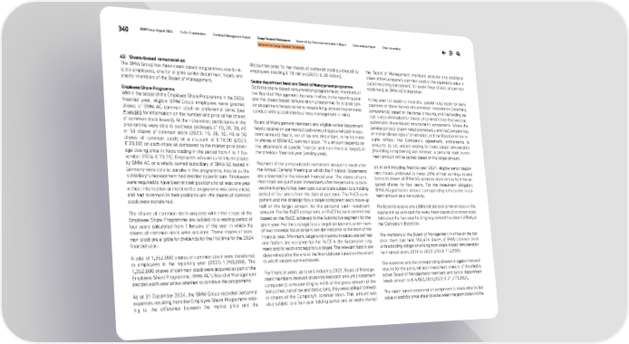 340 BMW Group Report 2024 To Our Stakeholders Combined Management Report Group Financial Statements Responsibility Statement and Auditor’s Report Remuneration Report Other Information Notes to the Group Financial Statements 42 Share-based remuneration The BMW Group has three share-based programmes: one for el- igible employees, one for eligible senior department heads and one for members of the Board of Management. Employee Share Programme Within the scope of the Employee Share Programme in the 2024 financial year, eligible BMW Group employees were granted shares of BMW AG common stock on preferential terms (see ↗ note [31] for information on the number and price of the shares of common stock issued). At their discretion, participants in the programme were able to purchase packages of 10, 20, 30, 40 or 50 shares of common stock (2023: 10, 20, 30, 40 or 50 shares of common stock) at a discount of € 16.00 (2023: € 20.00) on each share as compared to the market price (aver- age closing price in Xetra trading in the period from 4 to 7 No- vember 2024: € 70.75). Employees who are currently employed by BMW AG or a wholly owned subsidiary of BMW AG based in Germany were able to partake in the programme, insofar as the subsidiary’s management had decided to participate. Employees were required to have been in their positions for at least one year without interruption at the time the programme was announced, and had to remain in their positions until the shares of common stock were transferred. The shares of common stock acquired within the scope of the Employee Share Programme are subject to a vesting period of four years calculated from 1 January of the year in which the shares of common stock were acquired. These shares of com- mon stock are eligible for dividends for the first time for the 2024 financial year. A total of 1,352,000 shares of common stock were transferred to employees in the reporting year (2023: 1,290,000). The 1,352,000 shares of common stock were acquired as part of the Employee Share Programme. BMW AG’s Board of Management decides each year anew whether to continue the programme. As at 31 December 2024, the BMW Group recorded personnel expenses resulting from the Employee Share Programme relat- ing to the difference between the market price and the discounted price for the shares of preferred stock purchased by employees totalling € 18 million (2023: € 28 million). Senior department head and Board of Management programme Both the share-based remuneration programme for members of the Board of Management that was in effect in the reporting year and the share-based remuneration programme for eligible sen- ior department heads serve to reward long-term entrepreneurial conduct with sustainable business management in mind. Board of Management members and eligible senior department heads receive an earmarked cash amount (personal cash invest- ment amount) that is, net of tax and deductions, to be invested in shares of BMW AG common stock. This amount depends on the attainment of specific financial and non-financial targets in the previous financial year (vesting year). Payment of the personal cash investment amount is made after the Annual General Meeting at which the Financial Statements are presented for the relevant financial year. The shares of com- mon stock are purchased immediately after the personal cash in- vestment amount has been paid out and are subject to a holding period of four years from the date of purchase. The RoCE com- ponent and the strategic focus target component each make up half of the target amount for the personal cash investment amount. For the RoCE component, an RoCE factor is determined based on the RoCE achieved in the Automotive segment for the grant year. For the strategic focus target component, a minimum of two strategic focus targets are defined prior to the start of the financial year. Minimum, target and maximum values are defined and factors are assigned for the RoCE in the Automotive seg- ment and for each strategic focus target. The relevant factors are determined after the end of the financial year based on the extent to which targets were achieved. For financial years up to and including 2020, Board of Manage- ment members received an earmarked cash amount (investment component) corresponding to 45% of the gross amount of the bonus that, net of tax and deductions, they were obliged to invest in shares of the Company’s common stock. This amount was also subject to a four-year holding period and on expiry thereof the Board of Management members received one additional share of the Company’s common stock or the equivalent value in cash (matching component) for every three shares of common stock held, at BMW AG’s discretion. In the event of death or invalidity, special rules apply for early payment of share-based remuneration components (matching components) based on the target amounts, and the holding pe- riod is also eliminated for shares of common stock that were ac- quired with share-based remuneration components. Where the service contract is terminated prematurely and the Company has an extraordinary right of termination, or if the Board member re- signs without the Company’s agreement, entitlements to amounts as yet unpaid relating to share-based remuneration (matching components) are forfeited; a personal cash invest- ment amount will be settled based on the target amount. Up to and including financial year 2021, eligible senior depart- ment heads undertook to invest 26% of their earnings-related bonus in shares of BMW AG common stock and to hold the ac- quired shares for four years. For the investment obligation, BMW AG granted an amount corresponding to the entire invest- ment amount as a net subsidy. Participants receive one additional share of common stock or the equivalent value in cash for every three shares of common stock held once the four-year holding requirement has been fulfilled, at the Company