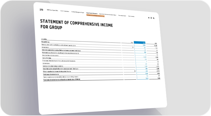 270 BMW Group Report 2024 To Our Stakeholders Combined Management Report Group Financial Statements Responsibility Statement and Auditor’s Report Remuneration Report Other Information Statement of Comprehensive Income for Group in € million Note 2024 2023 Net profit/loss 7,678 12,165 Remeasurement of the net liability for defined benefit pension plans 33 302 – 142 Income taxes – 50 24 Items not expected to be reclassified to the income statement in the future 252 – 118 Marketable securities (at fair value through other comprehensive income) 2 113 Derivative financial instruments – 3,306 – 1,808 Costs of hedging 919 766 Other comprehensive income from equity accounted investments 7 26 Income taxes 678 281 Currency translation foreign operations 1,108 – 1,772 Items that can be reclassified to the income statement in the future – 592 – 2,394 Other comprehensive income for the period after tax 19 – 340 – 2,512 Total comprehensive income 7,338 9,653 Total comprehensive income attributable to non-controlling interests 324 607 Total comprehensive income attributable to shareholders of BMW AG 7,014 9,046 TT STATEMENT OF COMPREHENSIVE INCOME FOR GROUP