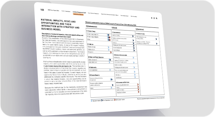 103 BMW Group Report 2024 To Our Stakeholders Combined Management Report Group Financial Statements Responsibility Statement and Auditor’s Report Remuneration Report Other Information Sustainability Statement MATERIAL IMPACTS, RISKS AND OPPORTUNITIES AND THEIR INTERACTION WITH STRATEGY AND BUSINESS MODEL Description of material impacts, risks and opportunities and their link to strategy and business model As part of the preparation of the 2024 Sustainability Statement, the material impacts, risks and opportunities were evaluated for the first time in accordance with the double materiality require- ments for sustainability topics. A total of 85 material impacts, risks and opportunities were identified. These can be assigned to the BMW Group’s business model and economic activities, as well as to the upstream or downstream value chain. The material impacts, risks and opportunities can be categorised under the 31 sustainability sub-topics and sub-sub-topics defined in ESRS 1 (see figure). A full outline and explanation of all material sustainability-related impacts, risks and opportunities identified can be found in the ↗ List of material Impacts, Risks and Opportunities. The overview also in- cludes a representation of the effect that material negative and positive impacts have on people and the environment, or could have in the case of potential impacts. For each impact, risk and opportunity listed, it also indicates whether or not they are also addressed by company-specific disclosures. The time horizons in which the material impacts, risks and opportunities are ex- pected to occur are also included. Most of the material impacts have already materialised. Because the methodology for the materiality assessment has been adjusted to reflect the first-time application of the ESRS re- quirements, it is not possible to make a comparison of the mate- rial impacts, risks and opportunities with the previous year. Material sustainability topics of BMW Group for Financial Year 2024 following ESRS E (Environmental) S (Social) G (Governance) E1 Climate Change S1 Own Workforce G1 Business Conduct Climate change adaptation Health and safety Political engagement and lobbying activities Climate change mitigation Gender equality and equal pay for work of equal Energy Corruption and bribery – Prevention and detection including training Diversity E2 Pollution Training and skills development Pollution of water Secure employment Pollution of soil Social dialogue Microplastic S2 Workers in the value chain E3 Water and Marine Resources Working time Water consumption Freedom of association, including the existence of work councils Water withdrawals Health and safety E4 Biodiversity Training and skills development Direct exploitation Measures against violence and harassment in the workplace E5 Circular Economy Child labour Resources inflows, including resource use Forced labour Resource outflows related to products and services S4 Consumers and End-Users Access to (quality) information Waste Privacy Health and safety Protection of children Upstream material Own Operations material Downstream material Materiality assessment requires the consideration of the total value chain.