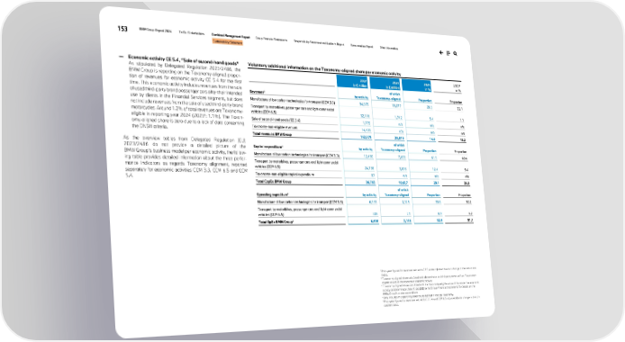 153 BMW Group Report 2024 To Our Stakeholders Combined Management Report Group Financial Statements Responsibility Statement and Auditor’s Report Remuneration Report Other Information Sustainability Statement — Economic activity CE 5.4, “Sale of second-hand goods” As stipulated by Delegated Regulation 2023/2486, the BMW Group is reporting on the Taxonomy-aligned propor- tion of revenues for economic activity CE 5.4 for the first time. This economic activity includes revenues from the sale of used third-party brand passenger cars after their intended use by clients in the Financial Services segment, but does not include revenues from the sale of used third-party brand motorcycles. Around 1.2% of total revenues are Taxonomy- eligible in reporting year 2024 (20231: 1.1%). The Taxon- omy-aligned share is zero due to a lack of data concerning the DNSH criteria. As the overview tables from Delegated Regulation (EU) 2023/2486 do not provide a detailed picture of the BMW Group’s business model per economic activity, the follow- ing table provides detailed information about the three perfor- mance indicators as regards Taxonomy alignment, reported separately for economic activities CCM 3.3, CCM 6.5 and CCM 5.4. Voluntary additional information on the Taxonomy-aligned share per economic activity 1 Prior-year figures for revenues related to CE 5.4 are adjusted due to a change in the calculation basis. 2 Taxonomy-aligned share calculated with denominator as third-party revenue from Taxonomy- eligible values of the respective economic activity. 3 Taxonomy-aligned share calculated with the Taxonomy-eligible value of the respective economic activity as denominator. See ↗ note [20] to the Group Financial Statements for details on the BMW Group’s capital expenditure. 4 Only includes the operating expenditure defined in the EU Taxonomy. 5 Prior-year figures for revenues related to CE 5.4 and CCM 6.5 adjusted due to change in the cal- culation basis. 2024 in € million 2024 in € million 2024 in % 2023⁵ in % Revenues2 by activity of which Taxonomy-aligned Proportion Proportion Manufacture of low carbon technologies for transport (CCM 3.3) 94,079 19,077 20.3 22.1 Transport by motorbikes, passenger cars and light commercial vehicles (CCM 6.5) 32,116 1,742 5.4 1.1 Sale of second-hand goods (CE 5.4) 1,775 n/a n/a n/a Taxonomy-non-eligible revenues 14,409 n/a n/a n/a Total revenues BMW Group 142,379 20,819 14.6 15.2 Capital expenditure3 by activity of which Taxonomy-aligned Proportion Proportion Manufacture of low carbon technologies for transport (CCM 3.3) 12,480 7,680 61.5 60.4 Transport by motorbikes, passenger cars and light commercial vehicles (CCM 6.5) 24,198 3,006 12.4 5.4 Taxonomy-non-eligible capital expenditure 87 n/a n/a n/a Total CapEx BMW Group 36,765 10,687 29.1 26.0 Operating expediture4 by activity of which Taxonomy-aligned Proportion Proportion Manufacture of low carbon technologies for transport (CCM 3.3) 6,331 2,125 33.6 32.2 Transport by motorbikes, passenger cars and light commercial vehicles (CCM 6.5) 305 21 6.9 4.2 Total OpEx BMW Group3 6,636 2,146 32.3 31.1