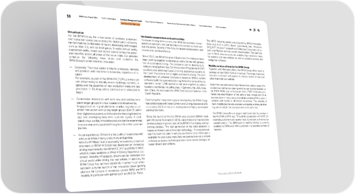 59 BMW Group Report 2024 To Our Stakeholders Combined Management Report Group Financial Statements Responsibility Statement and Auditor’s Report Remuneration Report Other Information Overview of the BMW Group Virtualisation For the BMW Group, the virtualisation of products, processes and interaction spaces are a catalyst for digitalisation, reflecting the fact that the combination of rapidly developing technologies such as Web 3.0, artificial intelligence, X-reality (virtual reality, augmented reality, mixed reality) and spatial computing gener- ates benefits across all areas of the value chain. Our activities comprise the following three pillars and underline the BMW Group’s commitment to innovation: — Corporate. The virtualisation of internal processes, methods and products with real-time collaboration, regardless of lo- cation For example, as part of the BMW iFACTORY, planners can use virtual reality to virtually assess buildings, systems, lo- gistics and the assembly of new production areas and test processes in 3D, long before construction is scheduled to begin. — Commercial. Interaction with both new and existing tech- savvy target groups in virtual spaces and virtual worlds. Engagement on digital platforms enables experience-ori- ented inter-action with young target groups (Gen Z) within their digital ecosystems with the aim of enhancing brand im- age and developing long-term customer loyalty. In dedi- cated virtual worlds, innovative products can be experienced in a new way and supported throughout the entire customer journey. — In-car experiences. Enhancing the quality of experience with a focus on infotainment, productivity and gaming. With the M Mixed Reality approach, for example, a team of engineers at BMW M GmbH has developed an immersive driving experience for the BMW M2*, M4* and BMW i5 M60*, which is made available to BMW M Driving Experience cus- tomers. Wearing VR goggles, drivers can be immersed in a virtual world while driving the real vehicle. In addition, the BMW Group has set new standards in varied in-car enter- tainment with the launch of the innovative casual gaming platform Air Console in numerous current BMW and MINI models, in particular with games such as UNO Car Party!. Worldwide cooperations and partnerships To ensure its long-term success, the BMW Group enters into tar- geted cooperations and partnerships with companies from vari- ous industries. Several of the Group’s largest collaborations and investments are listed below: Since 2022, the BMW Group and Qualcomm Technologies have been working together to develop solutions for the next genera- tion of automated driving. The companies aim to develop tech- nologies ranging from New Car Assessment Programme (NCAP) solutions and advanced Level 2 driving assistance systems to the Level 3 functionalities of highly automated driving. The joint development of software functions is based on BMW’s current software toolkit for automated driving. Within the terms of the co- operation, some 1,300 specialists will work together at various locations worldwide, including sites in Germany, the USA, Swe- den, China, Romania and the BMW Test Centre in Sokolov in the Czech Republic. Continuing their long-term supplier relationship, the BMW Group has collaborated with Valeo Comfort and Driving Assistance SAS since early 2023 on the joint development of highly automated parking functions. Since the launch of the first BMW voice assistant (BMW Intelli- gent Personal Assistant) in 2018, voice interaction has become an increasingly important part of the BMW iDrive display and op- erating concept. The next generation of the voice assistant is based on Alexa Custom Assistant technology. This new technol- ogy has been included in vehicles ex-factory since 2024 and is available for previously manufactured automobiles via a remote software up-grade, facilitating an even more natural dialogue be- tween drivers and vehicles. The HERE mapping service was acquired by BMW, Mercedes- Benz and Audi in 2015. Bosch, Continental, Intel, Mitsubishi (MC), NTT (Nippon Telegraph and Telephone Corporation of Ja- pan) and Pioneer are also current shareholders. The participa- tion in HERE ensures access to scalable, high-resolution maps for existing and new vehicles as well as geodata services and navigation software. Mobility services offered by the BMW Group Together with Mercedes-Benz, the BMW Group offers mobility services via the YOUR NOW joint venture. The range of services provides customers with access to various modes of transport other than their own vehicle. Apart from taxi cabs and private ride services, various types of e- scooters as well as car-sharing vehicles can also be booked via the FREE NOW app in European cities. FREE NOW also pro- motes the electrification of the vehicle fleet. Almost half of all journeys taken in taxis and personal hire vehicles (PHVs) were in vehicles with hybrid or all-electric drivetrains. The majority of multi-mobility journeys (e-scooters, e-mopeds, e-bikes, car shar- ing, car rentals) in the past year were emissions-free. The BMW Group offers a range of additional mobility services in the My BMW or MINI app. Through its cooperation with SIXT, for example, customers can access mobility services with exclusive special benefits. This BMW add-on mobility offering is currently available to BMW and MINI customers in a growing number of markets. * ↗ Consumption and Carbon Disclosures.