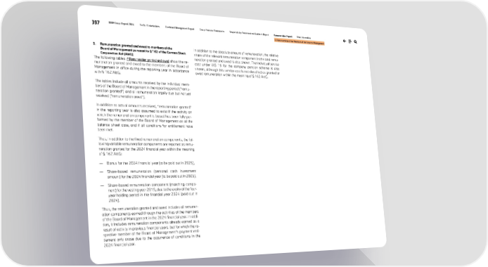 397 BMW Group Report 2024 To Our Stakeholders Combined Management Report Group Financial Statements Responsibility Statement and Auditor’s Report Remuneration Report Other Information II. Remuneration of the Members of the Board of Management 9. Remuneration granted and owed to members of the Board of Management pursuant to § 162 of the German Stock Corporation Act (AktG) The following tables ↗ Remuneration granted and owed show the re- muneration granted and owed to the members of the Board of Management in office during the reporting year in accordance with § 162 AktG. The tables include all amounts received by the individual mem- bers of the Board of Management in the reporting period (“remu- neration granted”) and all remuneration legally due but not yet received (“remuneration owed”). In addition to actual amounts received, “remuneration granted” in the reporting year is also assumed to exist if the activity on which the remuneration component is based has been fully per- formed by the member of the Board of Management as of the balance sheet date, and if all conditions for entitlement have been met. Thus, in addition to the fixed remuneration components, the fol- lowing variable remuneration components are reported as remu- neration granted for the 2024 financial year within the meaning of § 162 AktG: — Bonus for the 2024 financial year (to be paid out in 2025), — Share-based remuneration (personal cash investment amount) for the 2024 financial year (to be paid out in 2025), — Share-based remuneration component (matching compo- nent) for the vesting year 2019, due to the expiry of the four- year holding period in the financial year 2024 (paid out in 2024). Thus, the remuneration granted and owed includes all remuner- ation components earned through the activities of the members of the Board of Management in the 2024 financial year. In addi- tion, it includes remuneration components already earned as a result of activity in previous financial years, but for which the re- spective member of the Board of Management’s payment enti- tlement only arose due to the occurrence of conditions in the 2024 financial year. In addition to the absolute amount of remuneration, the relative share of the relevant remuneration component in the total remu- neration granted and owed is also shown. The individual service cost under IAS 19 for the company pension scheme is also shown, although this service cost is not classified as granted or owed remuneration within the meaning of § 162 AktG.