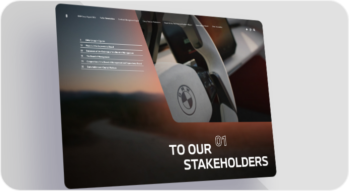 TO OUR STAKEHOLDERS 01 8 BMW Group Report 2024 To Our Stakeholders Combined Management Report Group Financial Statements Responsibility Statement and Auditor’s Report Remuneration Report Other Information 9 BMW Group in Figures 13 Report of the Supervisory Board 22 Statement of the Chairman of the Board of Management 30 The Board of Management 31 Composition of the Board of Management and Supervisory Board 35 Stakeholders and Capital Markets