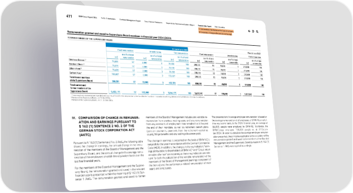 411 BMW Group Report 2024 To Our Stakeholders Combined Management Report Group Financial Statements Responsibility Statement and Auditor’s Report Remuneration Report Other Information III. Remuneration of the Members of the Supervisory Board / IV. Comparison of Change in Remuneration and Earnings Remuneration granted and owed to Supervisory Board members in financial year 2024 (2023) FORMER MEMBERS OF THE SUPERVISORY BOARD Financial year 2024 Financial year 2023 Fixed remuneration Attendance fee Total remuneration Fixed remuneration Attendance fee Total remuneration in € as a % of total remuneration in € as a % of total remuneration in € as a % of total remuneration in € as a % of total remuneration in € as a % of total remuneration in € as a % of total remuneration Christiane Benner1,2 74,638 97 2,000 3 76,638 100 200,000 95 10,000 5 210,000 100 Bernhard Ebner1,2 74,638 97 2,000 3 76,638 100 200,000 95 10,000 5 210,000 100 Johann Horn1,2 74,638 97 2,000 3 76,638 100 200,000 95 10,000 5 210,000 100 Gerhard Kurz3 166,667 97 6,000 3 172,667 100 200,000 95 10,000 5 210,000 100 Total former members of the Supervisory Board 390,581 97 12,000 3 402,581 100 800,000 95 40,000 5 840,000 100 Total current and former members of the Supervisory Board 5,652,175 97 192,000 3 5,844,175 100 5,629,545 97 198,000 3 5,827,545 100 1 These employee representatives have declared that they will transfer their remuneration to the Hans Böckler Foundation in accordance with the guidelines of the Confederation of German Trade Unions. 2 Member of the Supervisory Board until 15 May 2024. 3 Member of the Supervisory Board until 31 October 2024. IV. COMPARISON OF CHANGE IN REMUNER- ATION AND EARNINGS PURSUANT TO § 162 (1) SENTENCE 2 NO. 2 OF THE GERMAN STOCK CORPORATION ACT (AKTG) Pursuant to § 162 (1) Sentence 2 No. 2 AktG, the following table shows the change in earnings, the annual change in the remu- neration of the members of the Board of Management and the Supervisory Board, and the annual change in the average remu- neration of the employees on a full-time equivalent basis over the last five financial years. For the members of the Board of Management and the Supervi- sory Board, the remuneration granted and owed in the relevant financial year is presented within the meaning of § 162 (1) Sen- tence 1 AktG. The remuneration granted and owed to former members of the Board of Management includes any variable re- muneration from previous vesting years and any remuneration from any contracts of employment that remained valid beyond the end of their mandate, as well as retirement benefit plans (pension payments, payments from the retirement capital ac- count), fringe benefits and any waiting allowances paid. The change in earnings is presented on the basis of BMW AG’s net profit for the year in accordance with the German Commercial Code (HGB). In addition, the changes in the key indicators “earn- ings attributable to shareholders of BMW AG” and “Group return on sales after tax” are reported, as these key indicators are rele- vant for both the calculation of the variable remuneration of the members of the Board of Management (earnings component of the bonus) and the performance-related remuneration of man- agers and employees. The presentation of average employee remuneration is based on the average remuneration of all employees of BMW AG on a full- time equivalent basis. In the 2024 financial year, an average of 86,895 people were employed by BMW AG. Worldwide, the BMW Group employed 159,104 people as at 31 Decem- ber 2024. In order to calculate the average employee remuner- ation presented, the principles applicable to the calculation of the remuneration granted and owed to the members of the Board of Management and the Supervisory Board pursuant to § 162 (1) Sentence 1 AktG were applied accordingly.