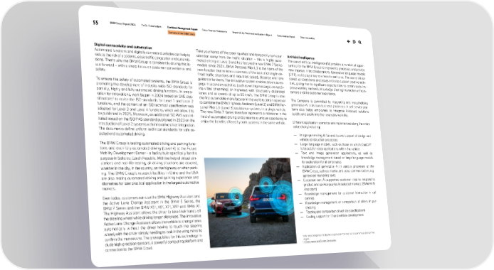 55 BMW Group Report 2024 To Our Stakeholders Combined Management Report Group Financial Statements Responsibility Statement and Auditor’s Report Remuneration Report Other Information Overview of the BMW Group Digital connectivity and automation Automated functions and digitally connected vehicles can help to reduce the risk of accidents, ease traffic congestion and cut emis- sions. That’s why the BMW Group is consistently driving this is- sue forward – with a sharp focus on customer convenience and safety. To ensure the safety of automated systems, the BMW Group is promoting the development of industry-wide ISO standards for partially, highly and fully automated driving functions. In prepa- ration for innovations, work began in 2024 based on SAE clas- sifications1 to revise the ISO standards for Level 1 and Level 2 functions, and the content of an ISO technical specification was adopted for Level 3 and Level 4 functions, which will allow it to be published in 2025. Moreover, an additional ISO PAS was ini- tiated based on the ISO PAS standard published in 2023 on the introduction of Level 2 systems with innovative driver integration. The documents define uniform technical standards for safe as- sisted and automated driving. The BMW Group is testing automated driving and parking func- tions and even fully automated driving (Level 4) at the Future Mobility Development Center - a facility built specifically for this purpose in Sokolov, Czech Republic. With the help of virtual sim- ulations and real-life testing, all driving situations are covered, whether in the city, in the country, on the highway or when park- ing. The BMW Group’s research facilities in China and the USA are also testing automated driving and gaining experience and kilometres for later practical application in the largest automotive markets. Even today, customers can use the BMW Highway Assistant and the Active Lane Change Assistant in the BMW 5 Series, the BMW 7 Series and the BMW X52, X62, X72, XM2 and BMW iX2. The Highway Assistant allows the driver to take their hands off the steering wheel while driving longer distances. The innovative Active Lane Change Assistant allows the vehicle to change lanes automatically without the driver having to touch the steering wheel, with the driver simply needing to look in the wing mirror to confirm the manoeuvre. The prerequisites for this technology in- clude high-precision sensors, a powerful computing platform and connection to the BMW Cloud. Take your hands off the steering wheel and temporarily turn your attention away from the traffic situation – this is highly auto- mated driving at Level 3 and has featured in new BMW 7 Series models since 2024. BMW Personal Pilot L3 is the name of the new function that relieves customers of the task of driving in de- fined traffic situations and regulates speed, distance and lane guidance for them. The innovative system enables drivers to en- gage in secondary activities (such as writing messages or watch- ing video streaming) on highways with structurally separated lanes and at speeds of up to 60 km/h. The BMW Group is also the first automobile manufacturer in the world to obtain approval to combine the BMW Highway Assistant (Level 2) and BMW Per- sonal Pilot L3 (Level 3) assistance systems in a single vehicle. The new BMW 7 Series therefore represents a milestone in the field of automated driving and presents a unique opportunity to enjoy the benefits offered by both systems in the same vehicle. Artificial intelligence The use of artificial intelligence (AI) provides a number of oppor- tunities for the BMW Group to improve its processes and provide new impetus in its collaborations. Generative language models (GPT) could play a key role here in particular. The use of AI can speed up operational processes and also support creative activ- ities, giving rise to significant opportunities to continuously im- prove working methods, knowledge sharing, interaction with cus- tomers and the customer experience. The Company is committed to integrating and industrialising generative AI in its own business processes. A self-service plat- form also helps employees to integrate AI-based solutions quickly and easily into their everyday work life. Different application scenarios are implemented along the entire value chain, including: — Image-generating AI for end-to-end support of design and vehicle construction processes — Large language models, such as those on which ChatGPT is based, for voice applications within the vehicle — Text and image generation applications, as well as knowledge management based on large language models for exploration for all employees — Application of generative AI in various processes at the BMW Group, such as: market and sales communication, e.g. generated marketing texts — Customer car: AI-supported customer chat to respond to product and service queries in selected markets (BMW/MINI Assistant) — Knowledge management for customer interaction in call centres — Knowledge management or comparison of offers in pur- chasing — Testing and comparison of vehicle specifications — Coding support for IT and vehicle development 1 SAE levels categorise the degree of automation from manual to autonomous driving in five stages. 2 ↗ Consumption and Carbon Disclosures. 2