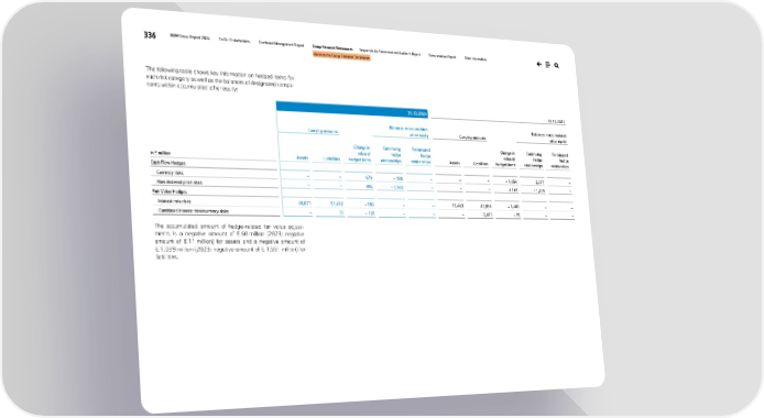 336 BMW Group Report 2024 To Our Stakeholders Combined Management Report Group Financial Statements Responsibility Statement and Auditor’s Report Remuneration Report Other Information Notes to the Group Financial Statements The following table shows key information on hedged items for each risk category as well as the balances of designated compo- nents within accumulated other equity: 31.12.2024 31.12.2023 Carrying amounts Change in value of hedged items Balances in accumulated other equity Carrying amounts Change in value of hedged items Balances in accumulated other equity in € million Assets Liabilities Continuing hedge relationships Terminated hedge relationships Assets Liabilities Continuing hedge relationships Terminated hedge relationships Cash Flow Hedges Currency risks – – 679 – 188 – – – – 1,654 2,377 – Raw material price risks – – 892 – 1,162 – – – 2,161 – 1,206 – Fair Value Hedges Interest rate risks 20,071 51,432 – 582 – – 13,443 41,854 – 1,401 – – Combined interest rate/currency risks – 31 – 120 – – – 2,605 – 75 – – The accumulated amount of hedge-related fair value adjust- ments is a negative amount of € 60 million (2023: negative amount of € 11 million) for assets and a negative amount of € 1,039 million (2023: negative amount of € 1,551 million) for liabilities.