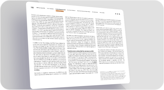 119 BMW Group Report 2024 To Our Stakeholders Combined Management Report Group Financial Statements Responsibility Statement and Auditor’s Report Remuneration Report Other Information Sustainability Statement Company-wide requirements related to climate change adapta- tion are continuously developed and implemented including with the help of infrastructure planning guidelines. One example is the planning premise that new sites will be operated without the use of fossil fuels, which has been approved by the Board of Man- agement. The implementation process is defined on the basis of relevant frameworks and guidelines, such as the Greenhouse Gas Protocol and science-based approaches for reducing CO2e emissions. The long-term corporate planning workflow was ex- panded in the 2024 reporting year to include the assessment and simulation of the impact on the BMW Group's absolute CO2e emissions. This was done to make the interactions between vol- ume, drivetrain mix, and supply chain more transparent within planning processes, and is achieved by integrating the impact on CO2e emissions directly into the scenarios used for volume and financial planning. In addition to the CO2e strategy, the BMW Group analyses the current and future regulatory requirements for emissions and drivetrain technologies as part of its long-term corporate plan- ning. This includes detailed strategic market and drivetrain fore- casts that are performed as part of volume planning. These fore- casts monitor and anticipate fleet carbon emissions limits, pollu- tants (including brake/tyre abrasion), quotas for electrified vehi- cles, and bans on registration of individual drivetrain technolo- gies. As part of the process for updating the BMW Group’s long- term corporate planning, vehicle volume plans, and the drivetrain mix of the BMW Group portfolio are updated on an annual and ongoing basis. The aim is to continue reducing emissions during the use phase of vehicles while also meeting changing market requirements. The consistent enhancement of the drivetrain portfolio therefore remains one of the BMW Group’s main levers for reducing carbon emissions in the use phase. ↗ Cornerstones of the Strategy Additionally to regulatory requirements, the BMW Group also factors regional and market-specific conditions into its strategic planning. This includes, in particular, the availability and expan- sion of the charging infrastructure for electrified vehicles, the pro- portion of renewable energies in the energy mix and the availa- bility of alternative low-carbon fuels. The analyses also include customer acceptance of different drivetrain options in different markets. Total-cost-of-ownership considerations, such as pur- chase incentives for electrified vehicles, vehicle taxation or the cost of the energy used to power a vehicle have a significant im- pact on customer acceptance. The findings are carefully as- sessed and incorporated into the process of designing the opti- mum drivetrain mix for the respective market. The BMW Group fulfils the regulatory requirements for fleet car- bon emissions in the main sales markets of the EU, USA and China while taking all of the relevant regulatory flexibilities into account, such as to the purchase of carbon credits. If regulatory carbon requirements change, the Company will determine whether the current planning needs to be adjusted as part of the annual strategic drivetrain forecast or whether additional action needs to be taken. This approach ensures that the regulatory re- quirements are met. Transition plan to achieve Net Zero emissions by 2050 The BMW Group aims to achieve net zero CO2e emissions across the entire value chain by latest 2050. This means that the una- voidable CO2e emissions remaining after the reduction measures will be equivalent to a maximum of 10% of the absolute emis- sions in the base year 2019. The Scope 3 emissions will account for around 99% of the remaining total emissions. The remaining 1% of the emissions are Scope 1 and 2 emissions. ↗ Preparing for Net Zero. This methodology is based on recognised definitions and specifications, including the ESRS. The transition plan for cli- mate change mitigation which will be used to achieve net zero consists initially of the CO2e reduction targets for 2030, which also relate to the base year 2019. These near-term targets (NTT) for the target year 2030 provide the guiding framework used to define the actions needed. These targets are in line with the climate targets set out in the Paris Agreement to limit global warming.1 From the 2024 reporting year onwards, the CO2e tar- gets will be converted from relative values to absolute values. By deriving guidelines for 2035, the time horizon of the target corri- dor will be extended. Science-based, cross-sectoral methods were used for each scope to derive CO2e reduction targets for 2030 in line with the approach of the Science Based Targets initiative (SBTi). Targets were assessed based on the source of the emissions according to the relevant categories of the Greenhouse Gas Protocol. Per- centage-based annual CO2e reduction targets relative to the base year 2019 were used. This is a representative base year that provides reliable and comparable values with regard to framework conditions such as sales volumes, emissions in each scope, and available technologies. By taking a systematic ap- proach, the BMW Group ensures that the climate targets for 2030 have been developed on the basis of solid data and have taken all relevant factors into consideration. The CO2e targets are integrated into the BMW Group's steering system. The Company has derived a 1.5°C-aligned pathway for Scope 1 and 22 emissions and integrated it in the corporate strategy. The BMW Group has defined a combined target for its Scope 3 emis- sions (including Purchased goods and services, Logistics, and the Use phase) in the Automotive segment due to the close in- terdependencies between the supply chain a