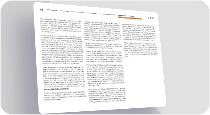 375 BMW Group Report 2024 To Our Stakeholders Combined Management Report Group Financial Statements Responsibility Statement and Auditor’s Report Remuneration Report Other Information I. Review of the 2024 Finacial Year from a Remuneration Perspectiver The remuneration system applicable for the members of the Board of Management in the 2024 financial year has been in ef- fect since 1 January 2021. The Annual General Meeting ap- proved it on 12 May 2021 with a majority of 91.60% of the valid votes cast. The Supervisory Board did not resolve any changes to the remuneration system or the target remuneration for the 2024 financial year. In December 2023, the Supervisory Board set ambitious targets linked to the variable remuneration of the members of the Board of Management for the 2024 financial year. Of the total variable target remuneration available, around 39% was linked to envi- ronmental, social or governance (ESG) targets. As in previous years, the Supervisory Board has set environmental targets as part of the strategic focus targets, which account for 50% of long-term variable remuneration (share-based payments) in the target, linked to the reduction of fleet carbon emissions in the EU and global sales of all-electric vehicles (BEVs), and has set am- bitious indicators. The Supervisory Board has thus incorporated the strategic importance of the Company’s transformation and compliance with the external requirements for fleet carbon emis- sions into the remuneration of the Board of Management. Target achievement for variable remuneration reflects the chal- lenging market environment. The financial and non-financial tar- gets for the short-term variable remuneration (bonus) were largely achieved thanks to the strong overall performance by the Board of Management ↗ Bonus for the 2024 financial year. However, in the context of long-term variable remuneration (share-based remuneration), the ambitious RoCE targets in the Automotive segment and the sales targets for all-electric vehicles were not achieved. By contrast, the ambitious targets related to the reduc- tion of fleet carbon emissions in the EU were exceeded ↗ Share- based remuneration for the 2024 financial year. The Board of Management’s total remuneration for the 2024 fi- nancial year is significantly lower than in the previous year, re- flecting appropriately the success and challenges involved in the Company’s performance. If necessary, and in the interest of the long-term success of BMW AG, the Supervisory Board may temporarily deviate from the remuneration system – as provided for in § 87a (2) Sentence 2 AktG. In accordance with G.11 of the German Corporate Gov- ernance Code dated 28 April 2022 (“GCGC”), the Supervisory Board has also reserved the right to make adjustments if extraor- dinary developments occur, such as significant acquisitions and disposals, or changes in accounting standards or tax regulations that have a significant impact. After due examination, it did not make use of these options for the 2024 financial year. The composition of the Board of Management and the level of remuneration applicable to the individual members of the Board of Management did not change during the year. The remuneration system for the members of the Supervisory Board is set out in § 16 of the Articles of Incorporation and pro- vides only for fixed remuneration. It was confirmed by the Annual General Meeting on 12 May 2021 with a majority of 99.40% of the valid votes cast, and implemented for the 2024 financial year in accordance with the provisions of the Articles of Incorporation. The composition of the Supervisory Board changed in the report- ing year following elections held in accordance with the German Co-Determination Act (Mitbestimmungsgesetz). Christiane Ben- ner, Bernhard Ebner and Johann Horn left the Supervisory Board with effect from the end of the Annual General Meeting on 15 May 2024. Ulrich Bauer, Horst Ott and Prof. Dr. Johanna Wenckebach were elected as new members of the Supervisory Board with effect from the same date. Due to retirement, Gerhard Kurz stepped down with effect from 31 October 2024. His re- placement, Dr. Michael Nikolaides, took his place with effect from 1 November 2024. The composition of the Personnel Committee, which is responsi- ble for the preparation of remuneration decisions, did not change in the 2024 financial year. With effect from 1 January 2025, the Supervisory Board revised the structure of the committees and resolved to establish a Remuneration Committee. The Remuner- ation Committee is responsible for the remuneration of the Board of Management and the Supervisory Board. In this capacity, it prepares the Remuneration Report and the decisions by the Su- pervisory Board on the remuneration of the Board of Manage- ment. The members of the Remuneration Committee acting as shareholder representatives are Dr.-Ing. Dr.-Ing. E.h. Norbert Reithofer, Stefan Quandt, Dr. Kurt Bock and Anke Schäferkordt, and employee representatives are Dr. Martin Kimmich, Stefan Schmid and Dr. Dominique Mohabeer. This increased the share of independent shareholder representatives and enhanced di- versity with regard to the handling of remuneration issues. The Remuneration Report for the 2023 financial year was con- firmed by the Annual General Meeting on 15 May 2024 with a majority of 94.99% of the valid votes cast. In view of the high level of approval, there was no reason to reconsider fundamental aspects of the implementation of the remuneration system in place during the past financial year or the manner of reporting. Changes were made to the presentation to make certain issues clearer.