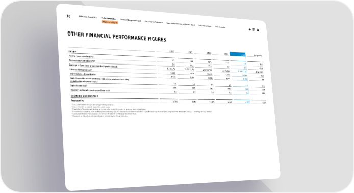 10 BMW Group Report 2024 To Our Stakeholders Combined Management Report Group Financial Statements Responsibility Statement and Auditor’s Report Remuneration Report Other Information BMW Group in Figures OTHER FINANCIAL PERFORMANCE FIGURES 2020 2021 2022 2023 2024 Change in % G R O U P Pre-tax return on sales in %1 5.3 14.4 16.5 11.0 7.7 – 30.0 Post-tax return on sales in %2 3.9 11.2 13.0 7.8 5.4 – 30.8 Earnings in € per share of common stock/preferred stock 5.73/5.75 18.77/18.79 27.31/27.33 17.67/17.69 11.62/11.64 –34.2/–34.2 Total capital expenditure3 6,222 7,518 10,610 11,440 12,581 10.0 Depreciation and amortisation 6,143 6,495 8,566 8,974 8,650 – 3.6 Capital expenditure ratio (excluding right-of-use assets and excluding capitalised development costs)4 3.6 3.9 4.3 4.9 5.7 16.3 Capitalisation rate5 36.6 36.5 39.3 33.6 38.8 15.5 Research and development expenditure ratio6 6.3 6.2 5.0 5.0 6.4 28.0 S E G M E N T A U T O M O T I V E Free cash flow 3,395 6,354 11,071 6,942 4,852 – 30.1 1 Group profit before tax as a percentage of Group revenues. 2 Group net profit as a percentage of Group revenues. 3 Expenditure for capitalised development costs, other intangible assets and property, plant and equipment. 4 Investments in property, plant and equipment (excluding right-of-use assets in accordance with IFRS 16) and other intangible assets (excluding capitalised development costs) as a percentage of Group revenues. 5 Capitalised development costs as a percentage of research and development expenditure. 6 Research and development expenditure as a percentage of Group revenues.