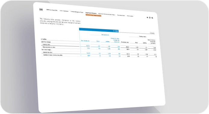 335 BMW Group Report 2024 To Our Stakeholders Combined Management Report Group Financial Statements Responsibility Statement and Auditor’s Report Remuneration Report Other Information Notes to the Group Financial Statements The following table provides information on the nominal amounts, carrying amounts and fair value changes of contracts designated as hedging instruments: 31.12.2024 31.12.2023 Nominal amounts Carrying amounts Change in fair value of designated components Nominal amounts Carrying amounts Change in fair value of designated components in € million Assets Liabilities Assets Liabilities Cash Flow Hedges Currency risks 34,539 329 680 -679 40,976 1,200 211 1,654 Raw material price risks 7,702 189 1,298 -892 8,848 325 1,387 -2,161 Fair Value Hedges Interest rate risks 54,325 183 1,650 582 49,236 288 1,956 1,414 Combined interest rate/currency risks 8,804 90 303 123 2,660 156 117 78