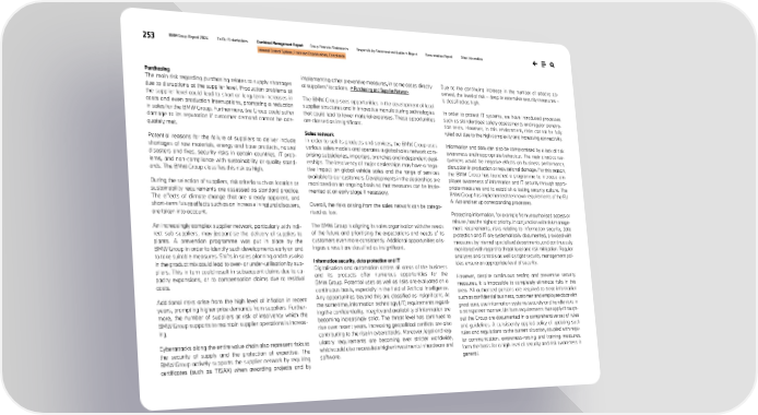 253 BMW Group Report 2024 To Our Stakeholders Combined Management Report Group Financial Statements Responsibility Statement and Auditor’s Report Remuneration Report Other Information Internal Control System, Risks and Opportunities, Compliance Purchasing The main risk regarding purchasing relates to supply shortages due to disruptions at the supplier level. Production problems at the supplier level could lead to short or long-term increases in costs and even production interruptions, prompting a reduction in sales for the BMW Group. Furthermore, the Group could suffer damage to its reputation if customer demand cannot be ade- quately met. Potential reasons for the failure of suppliers to deliver include shortages of raw materials, energy and base products, natural disasters and fires, security risks in certain countries, IT prob- lems, and non-compliance with sustainability or quality stand- ards. The BMW Group classifies this risk as high. During the selection of suppliers, risk criteria such as location or sustainability requirements are assessed as standard practice. The effects of climate change that are already apparent, and short-term future effects such as an increase in natural disasters, are taken into account. An increasingly complex supplier network, particularly with indi- rect sub-suppliers, may jeopardise the delivery of supplies to plants. A prevention programme was put in place by the BMW Group in order to identify such developments early on and to take suitable measures. Shifts in sales planning and thus also in the product mix could lead to over- or under-utilisation by sup- pliers. This in turn could result in subsequent claims due to ca- pacity expansions, or to compensation claims due to residual costs. Additional risks arise from the high level of inflation in recent years, prompting higher price demands from suppliers. Further- more, the number of suppliers at risk of insolvency which the BMW Group supports to maintain supplier operations is increas- ing. Cyberattacks along the entire value chain also represent risks to the security of supply and the protection of expertise. The BMW Group actively supports the supplier network by requiring certificates (such as TISAX) when awarding projects and by implementing other preventive measures, in some cases directly at suppliers’ locations. ↗ Purchasing and Supplier Network The BMW Group sees opportunities in the development of local supplier structures and in innovative manufacturing technologies that could lead to lower material expenses. These opportunities are classed as insignificant. Sales network In order to sell its products and services, the BMW Group uses various sales models and operates a global sales network com- prising subsidiaries, importers, branches and independent deal- erships. The insolvency of major dealerships may have a nega- tive impact on global vehicle sales and the range of services available to our customers. Developments in the dealerships are monitored on an ongoing basis so that measures can be imple- mented at an early stage if necessary. Overall, the risks arising from the sales network can be catego- rised as low. The BMW Group is aligning its sales organisation with the needs of the future and prioritising the expectations and needs of its customers even more consistently. Additional opportunities aris- ing as a result are classified as insignificant. Information security, data protection and IT Digitalisation and automation across all areas of the business and its products offer numerous opportunities for the BMW Group. Potential uses as well as risks are evaluated on a continuous basis, especially in the field of Artificial Intelligence. Any opportunities beyond this are classified as insignificant. At the same time, information technology (IT) requirements regard- ing the confidentiality, integrity and availability of information are becoming increasingly strict. The threat level has continued to rise over recent years. Increasing geopolitical conflicts are also contributing to the rise in cyberattacks. Moreover, legal and reg- ulatory requirements are becoming ever stricter worldwide, which could also necessitate higher investments in hardware and software. Due to the continuing increase in the number of attacks ob- served, the level of risk – despite extensive security measures – is classified as high. In order to protect IT systems, we have introduced processes such as standardised safety assessments and regular penetra- tion tests. However, in this environment, risks cannot be fully ruled out due to the high complexity and increasing connectivity. Information and data can also be compromised by a lack of risk awareness and inappropriate behaviour. The main direct conse- quences would be negative effects on business performance, disruption in production or reputational damage. For this reason, the BMW Group has launched a programme to increase em- ployee awareness of information and IT security through appro- priate measures and to establish a lasting security culture. The BMW Group has implemented the known requirements of the EU AI Act and set up corresponding processes. Protecting information, for example from unauthorised access or misuse, has the highest priority. In conjunction with risk manage- ment requirements, risks relating to information security, data protection and IT are systematically documented, provided with measures by internal specialised departments, and continuously monitored with regard to threat level and risk mitigation. Regular analyses and controls as well as tight security management pol- icies ensure an appropriate level of security. However, despite continuous testing and preventive security measures, it is impossible to completely eliminate risks in this area. All authorised persons are required to treat information such as confidential business, customer and employee data with great care, use information systems securely and handle risks 