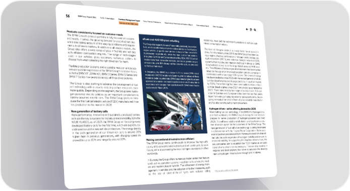56 BMW Group Report 2024 To Our Stakeholders Combined Management Report Group Financial Statements Responsibility Statement and Auditor’s Report Remuneration Report Other Information Overview of the BMW Group Products consistently focused on customer needs The BMW Group’s product portfolio is fully focused on custom- ers’ needs. It serves the growing demand for electrified vehicles while also taking account of the varying conditions and require- ments in different markets. In addition to all-electric models, the Group also offers a wide range of plug-in hybrids and vehicles with efficient combustion engines. The range of technologies used in our vehicles gives customers numerous options to choose from when selecting the right drivetrain for them. Flexible production systems and a scalable modular vehicle sys- tem are a visible expression of the BMW Group’s customer focus, with the BMW X1*, BMW X3*, BMW 3 Series, BMW 5 Series and BMW 7 Series now available across all three drive systems. The Group is also working to advance the development of fuel cell technology with a view to reducing carbon emissions even more quickly. Depending on the segment, the Group sees hydro- gen-powered electric vehicles as an important complement to battery-powered electric cars. The BMW Group plans to intro- duce the first fuel cell electric vehicle (FCEV) manufactured in se- ries production to the market in 2028. New generation of battery cells High-performance, innovative and sustainably produced battery cells are the key to success for individual electromobility. With the NEUE KLASSE, as of 2025 the BMW Group will be using newly developed battery cells for the first time, which are explicitly co- ordinated to suit the new vehicle architecture. The energy density in the sixth generation of our lithium-ion cells is around 20% higher than in previous generations, with charging speed im- proved by up to 30% and range by around 30%. Making conventional drivetrains more efficient The BMW Group works continuously to improve the high effi- ciency of its conventional drivetrains and will continue to do so in future, while also meeting the most stringent standards in effect worldwide. In Europe, the Group offers numerous model series that feature a 48-volt recuperation system, in addition to its all-electric mod- els and modern plug-in hybrids. The refinement of energy man- agement in vehicles and the adoption of further measures, such as the use of state-of-the-art tyres with reduced rolling resistance, have laid the technical foundations to achieve opti- mised consumption values. The level of nitrogen oxides is a crucial factor for air quality in cities. For this reason, since 2018 the BMW Group has been us- ing a highly effective combination of nitrogen oxide storage cat- alytic converters (NSCs) and selective catalytic reduction (SCR) systems that include urea injection (AdBlue) in almost all BMW diesel vehicles as well as in the larger diesel-powered MINI mod- els. The efficiency of exhaust gas aftertreatment has been further raised by the use of an improved oxidation catalytic converter in combination with a two-stage SCR system. This new technology has been available since 2020 with the revised generation of six- cylinder diesel engines and is expected to be in use in all models by 2026. The technology has been continually rolled out in four- cylinder diesel engines since 2021 and should be completed by 2027. There have already been signs of a reduction in NOx pol- lution in German and European cities over the last few years. Apart from various measures taken to reduce pollutants, the on- going renewal of the vehicle fleets of all automobile manufactur- ers has also contributed to the improvement. Hydrogen drives – series offering planned for 2028 After trialling fuel cell technology in the BMW iX5 Hydrogen in a pilot fleet worldwide, the BMW Group is taking the next steps to prepare for series production of hydrogen-powered cars from 2028. This will be an additional all-electric and locally emissions- free drivetrain option for the customers of the BMW Group. The next generation of fuel cell drive technology is being developed in collaboration with the Toyota Motor Corporation. Both coop- eration partners are advocating for framework conditions that will facilitate the early expansion of hydrogen mobility and ensure its economic viability. In supporting the requisite infrastructure, the two companies aim to establish the FCEV market as an addi- tional pillar to other drive technologies. They are also involved in regional and local projects that serve to advance the develop- ment of hydrogen infrastructure through joint initiatives. * ↗ Consumption and Carbon Disclosures. eFuels and HVO100 plant refuelling The Group also supports the use of sustainably produced, low-carbon fuels, which can effectively reduce the carbon emissions of combustion engine vehicles. A specific example here is the paraffinic diesel HVO (hydrotreated vegetable oil), which has been sold at fuel stations throughout Germany and Europe since late May 2024. HVO100, a fuel made entirely from renewable materials, can reduce greenhouse gas emissions by up to 90% throughout the entire life cycle, as compared to the fossil fuel diesel. In December, the BMW Group started to fill its current BMW diesel models with HVO100 at plants in Germany, prior to delivery of these models to dealer organisations. BMW Group diesel engines have been approved on a series- and model specific basis to use the new fuel in accordance with European fuel specification EN 15940 since the pro- duction month March 2015.