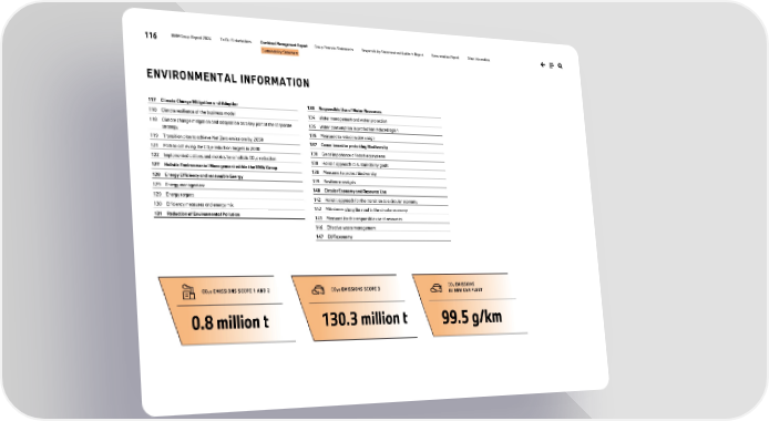 116 BMW Group Report 2024 To Our Stakeholders Combined Management Report Group Financial Statements Responsibility Statement and Auditor’s Report Remuneration Report Other Information Sustainability Statement ENVIRONMENTAL INFORMATION 117 Climate Change Mitigation and Adaption 118 Climate resilience of the business model 118 Climate change mitigation and adaptation as a key part of the corporate strategy 119 Transition plan to achieve Net Zero emissions by 2050 121 Path to achieving the CO2e reduction targets in 2030 122 Implemented actions and metrics for a holistic CO2e reduction 127 Holistic Environmental Management within the BMW Group 128 Energy Efficiency and renewable Energy 129 Energy management 129 Energy targets 130 Efficiency measures and energy mix 131 Reduction of Environmental Pollution 133 Responsible Use of Water Resources 134 Water management and water protection 135 Water consumption in production reduced again 135 Measures to reduce water usage 137 Commitment to protecting Biodiversity 138 Great importance of intact ecosystems 138 Holistic approach to sustainability goals 138 Measures to protect biodiversity 139 Resilience analysis 140 Circular Economy and Resource Use 142 Holistic approach for the transition to a circular economy 142 Milestones along the road to the circular economy 143 Measures for the responsible use of resources 146 Effective waste management 147 EU Taxonomy CO2 EMISSIONS EU NEW CAR FLEET CO2e EMISSIONS SCOPE 1 AND 2 CO2e EMISSIONS SCOPE 3 0.8 million t 130.3 million t 99.5 g/km