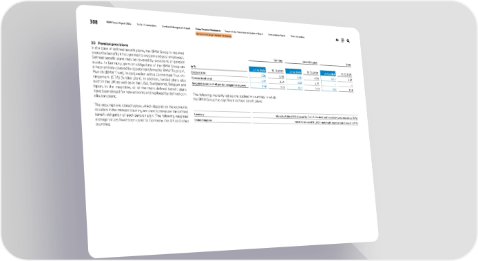 308 BMW Group Report 2024 To Our Stakeholders Combined Management Report Group Financial Statements Responsibility Statement and Auditor’s Report Remuneration Report Other Information Notes to the Group Financial Statements 33 Pension provisions In the case of defined benefit plans, the BMW Group is required to pay the benefits it has granted to present and past employees. Defined benefit plans may be covered by provisions or pension assets. In Germany, pension obligations of the BMW Group are almost entirely covered by assets transferred to BMW Trust e.V., Munich (BMW Trust), in conjunction with a Contractual Trust Ar- rangement (CTA) (funded plan). In addition, funded plans also exist in the UK as well as in the USA, Switzerland, Belgium and Japan. In the meantime, all of the main defined benefit plans have been closed for new entrants and replaced by defined con- tribution plans. The assumptions stated below, which depend on the economic situation in the relevant country, are used to measure the defined benefit obligation of each pension plan. The following weighted average values have been used for Germany, the UK and other countries: The following mortality tables are applied in countries in which the BMW Group has significant defined benefit plans: Germany United Kingdom Other in % 31.12.2024 31.12.2023 31.12.2024 31.12.2023 31.12.2024 31.12.2023 Discount rate 3.36 3.19 5.48 4.54 6.13 5.57 Pension level trend 2.01 2.24 2.28 2.17 – – Weighted duration of all pension obligations in years 13.0 13.8 12.1 13.1 12.2 12.8 Germany Mortality Table 2018 G issued by Prof. K. Heubeck (with invalidity rates reduced by 70%) United Kingdom S4PA Tables and CMI_2023 model with improvement factor of 1.25%