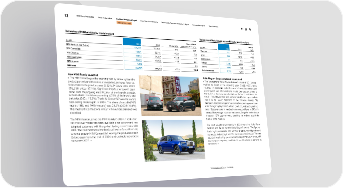 82 BMW Group Report 2024 To Our Stakeholders Combined Management Report Group Financial Statements Responsibility Statement and Auditor’s Report Remuneration Report Other Information Financial Performance Deliveries of MINI vehicles by model variant in units 2024 2023 Change in % Share of MINI deliveries 2024 in % MINI Hatch (3- and 5-door) 128,635 155,607 – 17.3 52.5 MINI Convertible 18,994 32,141 – 40.9 7.8 MINI Clubman 10,693 24,207 – 55.8 4.4 MINI Countryman 80,971 83,403 – 2.9 33.1 MINI Aceman 5,632 – – 2.3 MINI total 244,925 295,358 – 17.1 100.0 Deliveries of Rolls-Royce automobiles by model variant in units 2024 2023 Change in % Phantom 413 505 – 18.2 Ghost 808 1,510 – 46.5 Wraith/Dawn 11 168 – 93.5 Cullinan 2,590 3,523 – 26.5 Spectre 1,890 326 479.8 Rolls-Royce total 5,712 6,032 – 5.3 New MINI Family launched » The MINI brand began the reporting year by renewing its entire product portfolio and therefore, as expected, delivered fewer ve- hicles than in the previous year (2024: 244,925 units; 2023: 295,358 units; –17.1%). Significant impetus for growth again came from the ongoing electrification of the brand’s portfolio, with all-electric models representing 22.9% of the brand’s total deliveries (2023: 15.3%). The MINI Cooper SE* was the brand’s best-selling model again in 2024. The share of electrified MINI models (BEV and PHEV models) was 23.9% (2023: 20.8%). This means that almost one in four MINI vehicles delivered was electrified. The MINI Aceman joined the MINI Family in 2024. The all-elec- tric crossover model has been available since autumn and has delighted customers with the go-kart feeling synonymous with MINI. The next member of the family will excite fans of fresh air, with the popular MINI Convertible* leaving the production line in Oxford again from the end of 2024 and available to purchase from early 2025. « Rolls-Royce – Bespoke sales at record level » The luxury brand Rolls-Royce delivered a total of 5,712 auto- mobiles to clients in the reporting year (2023: 6,032 units; –5.3%). The moderate reduction was in line with the marque´s planning and was attributable to model changeovers ahead of the launch of the new models Cullinan Series II* and Ghost Se- ries II*. Rolls-Royce was also somewhat affected by muted de- mand in the luxury segment of the Chinese market. The marque´s Bespoke programme, centred on creating value for cli- ents through highly individualised products, enjoyed great suc- cess. Bespoke content reached a new record level in 2024. In terms of the average value per motor car, Bespoke content value increased 10% year-on-year, reaching the highest level in the history of the marque. The most sought-after models in 2024 were the Rolls-Royce Cullinan* and the all-electric Rolls-Royce Spectre*. The Spectre* had a highly successful first full year of sales, with high demand worldwide. In Europe, it was the most requested model. The year 2025 will mark a high point in the history of the luxury brand, with the marque´s flagship, the Rolls-Royce Phantom, celebrating its centenary. « * ↗ Consumption and Carbon Disclosures. * *