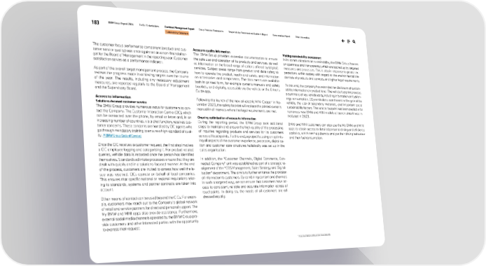 183 BMW Group Report 2024 To Our Stakeholders Combined Management Report Group Financial Statements Responsibility Statement and Auditor’s Report Remuneration Report Other Information Sustainability Statement The customer focus performance component (product and cus- tomer service quality) was once again set as a non-financial tar- get for the Board of Management in the reporting year. Customer satisfaction serves as a performance indicator. As part of the overall target management process, the Company reviews the progress made in achieving targets over the course of the year. The results, including any necessary adjustment measures, are reported regularly to the Board of Management and the Supervisory Board. Access to information Solutions-focused customer service The BMW Group provides numerous ways for customers to con- tact the Company. The Customer Interaction Centre (CIC), which can be contacted over the phone, by email or letter and, in an increasing number of countries, via a chat function, receives cus- tomer concerns. These concerns are handled by CIC agents who go through mandatory training to ensure a high standard of qual- ity. ↗ BMW Group Code of Conduct Once the CIC receives a customer request, the first step involves a CIC employee logging and categorising it. For product-related queries, vehicle data is recorded once the person has identified themselves. Standardised intake processes ensure that they are dealt with quickly and in a solutions-focused manner. At the end of the process, customers are invited to assess how well the is- sue was resolved. CICs operate on behalf of local companies. This ensures that specific national or regional regulations relat- ing to standards, systems and partner contracts are taken into account. Other means of contact can be used beyond the CICs. For exam- ple, customers may reach out to the Company’s global network of retail and service partners for direct and personal support. The My BMW and MINI apps also provide assistance. Furthermore, external social media channels operated by the BMW Group pro- vide customers and other interested parties with the opportunity to express their request. Access to quality information The BMW Group provides extensive documentation to ensure the safe use and operation of its products and services, as well as information on the broad range of options offered by (digital) services. Subject areas range from product and data safety to how to operate the product, health and safety, and information on accessories and components. The documents are available both in printed form, for example owner’s manuals and safety booklets, and digitally, accessible via the vehicle or the Driver’s Guide app. Following the launch of the new all-electric MINI Cooper* in No- vember 2023, the safety booklet will replace the printed owner’s manual in all markets where the legal requirements are met. Ongoing optimisation of access to information During the reporting period, the BMW Group took additional steps to maintain and ensure the high quality of the processing of inquiries regarding products and services for its customers across all touchpoints. To this end, a project focusing on optimis- ing all aspects of the customer experience, processes, digitalisa- tion and customer care structures holistically was set up in the sales organisation. In addition, the “Customer Channels, Digital Commerce, Con- nected Company” unit was established as part of a strategic re- alignment of the “CBS Management, Sales Strategy and Digital- isation” department. The aim is to further enhance the provision of information to customers. By combining content and channels in such a targeted way, we can ensure that customers have ac- cess to consistent, reliable and accurate information across all touchpoints. In doing so, the needs of all customers are ad- dressed equally. Making sustainability transparent In its communications on sustainability, the BMW Group focuses on openness and transparency, which are backed up by targeted measures and processes. This is also in response to greater ex- pectations within society with regard to the environmental cre- dentials of products and services, and tighter legal requirements. To this end, the company has extended the disclosure of sustain- ability information on product level. The vehicle footprint provides a summary of key vehicle data, including information on fuel/en- ergy consumption, CO2e emissions over the entire life cycle of the vehicle, the use of secondary materials, and important social sustainability factors. The vehicle footprint has been available for numerous new BMW and MINI models at launch since it was in- troduced in 2023. BMW and MINI customers can also use the My BMW and MINI apps to obtain access to detailed personal driving and efficiency statistics, which can help them to analyse their driving behaviour and their fuel consumption. * ↗ Consumption and Carbon Disclosures.
