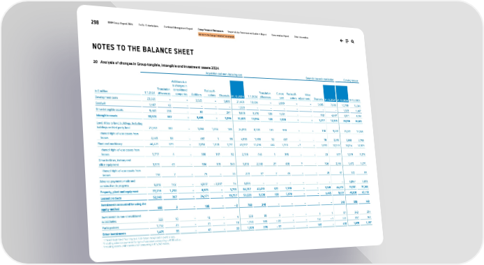 298 BMW Group Report 2024 To Our Stakeholders Combined Management Report Group Financial Statements Responsibility Statement and Auditor’s Report Remuneration Report Other Information Notes to the Group Financial Statements NOTES TO THE BALANCE SHEET 20 Analysis of changes in Group tangible, intangible and investment assets 2024 Acquisition and manufacturing cost Depreciation and amortisation Carrying amount in € million 1.1.2024 Translation differences Additions due to changes in consolidated companies Additions Reclassifi- cations Disposals 31.12.2024 1.1.2024 Translation differences Current year Reclassifi- cations Value adjustments1 Disposals 31.12.2024 31.12.2024 31.12.2023 Development costs 23,028 – – 3,525 – 5,085 21,468 10,684 – 2,089 – – 5,085 7,688 13,780 12,344 Goodwill 1,487 42 – – – – 1,529 – – – – – – – 1,529 1,487 Other intangible assets 9,461 315 – 83 – 251 9,608 3,270 128 1,431 – – 132 4,697 4,911 6,191 Intangible assets 33,976 357 – 3,608 – 5,336 32,605 13,954 128 3,520 – – 5,217 12,385 20,220 20,022 Land, titles to land, buildings, including buildings on third party land 21,957 388 – 1,066 1,664 185 24,890 8,709 131 999 – – 150 9,689 15,201 13,248 thereof right-of-use assets from leases 4,449 58 – 497 1 95 4,910 1,659 12 457 – – 78 2,050 2,860 2,790 Plant and machinery 46,425 679 – 2,856 1,828 3,191 48,597 31,496 464 3,723 – 7 – 3,093 32,583 16,014 14,929 thereof right-of-use assets from leases 1,717 4 – 300 167 52 2,136 444 1 395 – – 23 817 1,319 1,273 Other facilities, factory and office equipment 3,519 49 – 506 105 343 3,836 2,248 27 408 7 – 326 2,364 1,472 1,271 thereof right-of-use assets from leases 156 7 – 79 – 33 209 67 2 46 – – 28 87 122 89 Advance payments made and construction in progress 5,818 142 – 4,5452 – 3,597 14 6,894 – – – – – – – 6,8943 5,818 Property, plant and equipment 77,719 1,258 – 8,973 – 3,733 84,217 42,453 622 5,130 – – 3,569 44,636 39,581 35,266 Leased products 52,948 967 – 24,171 – 19,757 58,329 9,830 128 5,978 – – 6,445 9,491 48,838 43,118 Investments accounted for using the equity method 683 3 – 105 – – 2 793 240 – – – – – 240 553 443 Investments in non-consolidated subsidiaries 323 10 – 10 – 4 339 89 3 – – 6 1 97 242 234 Participations 1,152 25 – 31 – 18 1,190 189 – 20 – – 163 – 1 333 857 963 Other investments 1,475 35 – 41 – 22 1,529 278 – 17 – – 169 – 430 1,099 1,197 1 Thereof expense amounting to € 169 million recognised in profit or loss. 2 Including advance payments for right-of-use assets amounting to € 38 million. 3 Including assets under construction amounting to € 5,963 million.