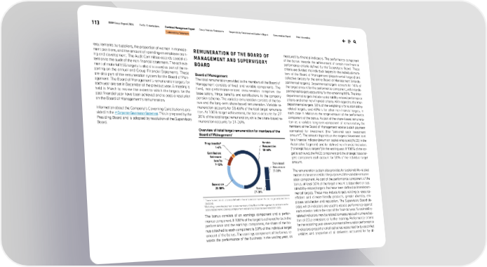 113 BMW Group Report 2024 To Our Stakeholders Combined Management Report Group Financial Statements Responsibility Statement and Auditor’s Report Remuneration Report Other Information Sustainability Statement requirements by suppliers, the proportion of women in manage- ment positions, and the amount of spending on employee train- ing and development. The Audit Committee accords special at- tention to the audit of the non-financial statement. The achieve- ment of material ESG targets is also discussed as part of the re- porting on the annual and Group Financial Statements. These are also part of the remuneration system for the Board of Man- agement. The Board of Management’s remuneration targets for each year are set in December of the previous year. A meeting is held in March to review the extent to which the targets for the past financial year have been achieved and to pass a resolution on the Board of Management’s remuneration. Information about the Company’s Governing Constitution is pro- vided in the ↗ Corporate Governance Statement. This is prepared by the Presiding Board and is adopted by resolution of the Supervisory Board. REMUNERATION OF THE BOARD OF MANAGEMENT AND SUPERVISORY BOARD Board of Management The total remuneration provided to the members of the Board of Management consists of fixed and variable components. The fixed, non-performance-related remuneration comprises the base salary, fringe benefits and contributions to the company pension scheme. The variable remuneration consists of the bo- nus and the long-term share-based remuneration. Variable re- muneration accounts for 58-66% of the total target remunera- tion. At 100% target achievement, the bonus accounts for 27- 30% of the total target remuneration, while the share-based re- muneration accounts for 31-36%. Overview of total target remuneration for members of the Board of Management1 1 The remuneration structure as defined in the remuneration system for total target remuneration is depicted. 2 Excluding a possible payment to new members of the Board of Management to compensate for salary losses from a previous employment relationship and/or to cover relocation costs. The bonus consists of an earnings component and a perfor- mance component. If 100% of the target is achieved for both the performance and the earnings component, the share of the bo- nus attached to each component is 50% of the individual target amount of the bonus. The earnings component of the bonus re- wards the performance of the business in the vesting year, as measured by financial indicators. The performance component of the bonus rewards the achievement of certain non-financial performance criteria defined by the Supervisory Board. These criteria are divided into individual targets for the individual mem- bers of the Board of Management (departmental targets) and collective targets for the entire Board of Management (interde- partmental targets). Departmental targets account for 10% of the target amount for the performance component, with interde- partmental targets accounting for the remaining 90%. The inter- departmental targets include sustainability-related performance criteria and other non-financial criteria. With regard to the inter- departmental targets, 50% of the weighting is for sustainability- related targets, and 40% is for other non-financial targets, in each case in relation to the target amount of the performance component of the bonus. As part of the share-based remunera- tion as a variable long-term component of remuneration, the members of the Board of Management receive a cash payment earmarked for investment (the “personal cash investment amount”). The amount depends on the target achievement level for a financial indicator (return on capital employed (RoCE) in the Automotive Segment) and for defined non-financial indicators (“strategic focus targets”) in the vesting year. If 100% of the tar- get is achieved, the RoCE component and the strategic focus tar- gets component each account for 50% of the individual target amount. The remuneration system also provides for sustainability-related matters to be assessed for the purposes of the variable remuner- ation component. As part of the performance component of the bonus, at least 50% of the target amount is dependent on sus- tainability-related targets that have been defined as interdepart- mental targets. These may include targets relating to resource- efficient and climate-friendly products, gender diversity, em- ployee satisfaction and reputation. The Supervisory Board de- cides which indicators are used to assess performance against each criterion before the start of the financial year. Sustainability- related indicators may be related to measures such as the reduc- tion of CO2e emissions or further training. Performance criteria for the reporting year are environmental innovation performance (indicators: proportion of all deliveries accounted for by electrified vehicles and proportion of all deliveries accounted for by all- Variable Remuneration 58-66% Base salary 25-30% Contributions Retirement benefits 7-12% Fringe benefits² 1-4% Bonus 27-30% Share-based Remuneration 31-36%