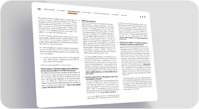 152 BMW Group Report 2024 To Our Stakeholders Combined Management Report Group Financial Statements Responsibility Statement and Auditor’s Report Remuneration Report Other Information Sustainability Statement The allocator is based on detailed long-term corporate planning for the next six years, as approved each year by the Board of Management and Supervisory Board. This formula is used for capital expenditure on property, plant and equipment (including right-of-use assets from lessee relationships), intangible assets and expenditure on research and development for economic ac- tivity CCM 3.3. For operating expenditure, the allocator is only applied to non-capitalised development costs. For other operating expenditure (non-capitalised right-of-use assets (lessee), maintenance/repair expenses) relating to eco- nomic activity CCM 3.3, the formula is based on the Taxonomy- aligned revenues generated from the Automotive and Motorcy- cles segments in the reporting period. For Taxonomy-eligible and Taxonomy-aligned capital expendi- ture for economic activity CCM 6.5, the allocator is based on the Taxonomy-aligned financing volume for new customers in the current financial year: — Allocator for economic activity CCM 6.5: DNSH alignment factor x BEV proportion x financing volume attributable to new customer contracts (2024) It refers to capital expenditure on leased products. Further increase in Taxonomy-aligned capital expenditure and operating expenditure in the 2024 reporting year The following overview tables summarise the performance indi- cators revenues, capital expenditure and operating expenditure from Taxonomy-eligible and Taxonomy-aligned economic activ- ities of the BMW Group. Regardless of the Taxonomy require- ments, the BMW Group regularly and comprehensively ad- dresses risks arising from climate change and their potential im- pact on its locations and supply chains. ↗ Climate change adaptation, ↗ Climate Change Mitigation and Adaptation — BMW Group perspective Both performance indicators - capital expenditure and oper- ating expenditure - continued to grow year on year at the BMW Group level. This reflects the BMW Group’s increased investment in sustainable products and plant infrastructure as part of the ongoing electrification process. The Taxon- omy-aligned proportion of capital expenditure was 29.1%, which was 3.1% higher than in 2023 (€ 10,687 million). Taxonomy-aligned capital expenditure as a proportion of the BMW Group’s total capital expenditure is impacted sig- nificantly by additions related to leased products. Conse- quently, an examination of the proportion of Taxonomy- aligned capital expenditure at the BMW Group level does not reflect the huge investment in sustainable economic activi- ties and products. Operating expenditure incurred for Tax- onomy-aligned economic activities amounted to € 2,146 million, corresponding to over 32% of Taxonomy- eligible operating expenditure (2023: 31%). The Taxonomy-aligned proportion of the BMW Group’s rev- enues fell slightly in 2024. They amounted to € 20,819 mil- lion (2023: € 23,690 million), corresponding to 14.6% of total Group revenues and a decrease on the previous year of about half a percentage point. This was mainly driven by changes in the pricing structure of the Taxonomy-aligned BEV portfolio and negative elimination effects between the Automotive segment and the Financial Services segment. ↗ Voluntary additional information on the Taxonomy-aligned share per economic activity — Economic activity CCM 3.3, “Manufacture of low-carbon technologies for transport” The Taxonomy-aligned share of revenues generated by the Automotive and Motorcycles segments corresponded to 13.4% (economic activity CCM 3.3 “Manufacture of low- carbon technologies for transport”) of total Group revenues (2023: 15.0%). As a percentage of third-party revenues of the two segments, the Taxonomy-aligned share equaled to 20.3% (2023: 22.1%). ↗ Course of Business and Segments The Taxonomy-aligned proportion of capital expenditure fell slightly by just under 2 percentage points to 20.9% (2023: 22.7%). This is due to the disproportionate increase in total capital expenditure relative to capital expenditure in the Au- tomotive and Motorcycles segments. Looking only at the Taxonomy-aligned additions to intangible assets and prop- erty, plant and equipment in the context of additions rec- orded by the Automotive and Motorcycles segments, how- ever, the proportion of Taxonomy-aligned capital expendi- ture went up by a percentage point to 61.5%. ↗ Voluntary additional information on the Taxonomy-aligned share per economic activity — Economic activity CCM 6.5, “Transport by motorbikes, passenger cars and light commercial vehicles” The Taxonomy-aligned shares for the three performance in- dicators are at a low single-digit level for the Financial Ser- vices segment, but are on an upwards trajectory. This is due to the fact that there is a time lag before the effects of the vehicle fleet electrification ramp-up impact the financing and leasing lines of business. A further reason is the varied, stricter DNSH requirements for economic activity CCM 6.5, in particular those relating to Environmental Objective V “Pollution prevention and control”, which lead to the exclu- sion of almost all PHEV and a significant restriction in the recognition of BEV (for details see section ↗ Do no significant harm). Third-party brands are not included in the vehicle port- folio in the reporting on Taxonomy alignment for economic activity CCM 6.5. A lack of available data regarding the tyre categories or WLTP emission values of third-party products makes it impossible to review compliance with the DNSH criteria in full. The Taxonomy-aligned proportion of capital expenditure in the Financial Services segment rose by almost 250% on the previous year to 8.2% (€ 3,006 million). Based on total cap- ital expenditure in the Financial 