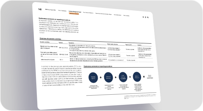 148 BMW Group Report 2024 To Our Stakeholders Combined Management Report Group Financial Statements Responsibility Statement and Auditor’s Report Remuneration Report Other Information Sustainability Statement Explanatory comments on reporting procedures An economic activity is to be seen as Taxonomy-eligible if it is described in the Delegated Acts relating to one of the six envi- ronmental objectives, regardless of whether that economic activ- ity meets the technical screening criteria stipulated in those Del- egated Acts. Following an analysis, the BMW Group’s business activities can be summarised under the following economic ac- tivities*: Overview of economic activities Economic activities Code(s) Description Environmental objectives Reporting 2024 Comments Manufacture of low carbon technol- ogies for transport CCM 3.3, CCA 3.3 The production of automobiles and motorcycles, excluding - the sale of parts and components, such as after-sales business excluding the provi- sion of repair services, - the supply of components for production to third parties I „Climate change mitigation“ II „Climate change adaptation“ Taxonomy alignment Contribution to Environmental objec- tives II is subsumed under Environ- mental objective I Transport by motorbikes, passen- ger cars and light commercial vehi- cles CCM 6.5, CCA 6.5 The acquisition, financing, lease and operation of automobiles and motorcycles, ex- cluding banking and insurance services performed by our non-automotive Financial Services segment I „Climate change mitigation“ II „Climate change adaptation“ Taxonomy alignment Contribution to Environmental objec- tives II is subsumed under Environ- mental objective I Sale of second-hand goods CE 5.4 Sale of used third-party brand cars purchased by the BMW Group from external par- ties and resold to external third parties at the end of the lease agreement IV „Transition to a circular economy“ Taxonomy alignment In contrast to the previous year, economic activity CE 5.4 only includes the sale of used third-party brand automobiles that are purchased by the BMW Group from third parties and resold to external third parties at the end of the lease agreement. The sale of lease returns from BMW Group brands, on the other hand, is reported under CCM 6.5. While all lease and financing activities are still reported under CCM 6.5 in their entirety, this change draws a clear distinction between the remarketing of BMW Group brand vehicles on the one hand (CCM 6.5) and the sale or trade of second-hand automobiles on the other (CE 5.4). Explanatory comments on reporting procedures * The additional economic activities specified in Delegated Regulation (EU) 2022/1214 of 9 March 2022 (in particular with regard to nuclear energy and gaseous fossil fuels) are not relevant to the BMW Group. Economic activities are described in one of the Delegated Acts Substantial contribution to at least one of the environmental objectives Taxonomy eligibility Substantial Contribution Do No Significant Harm (DNSH) Economic activity is Taxonomy-aligned + + + = Minimum Safeguards Economic activity does not cause significant harm to other environmental objectives Company establishes minimum safeguard procedures for human rights, bribery and corruption, taxation and fair competition