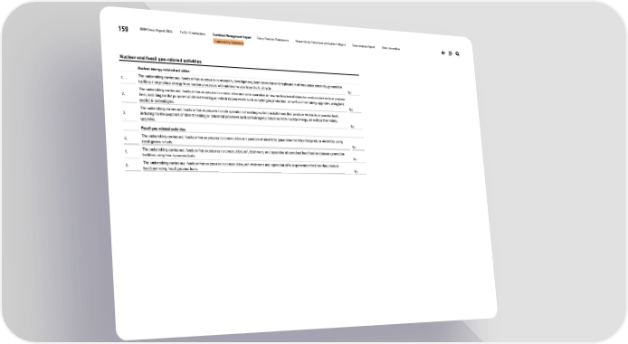 159 BMW Group Report 2024 To Our Stakeholders Combined Management Report Group Financial Statements Responsibility Statement and Auditor’s Report Remuneration Report Other Information Sustainability Statement Nuclear and fossil gas-related activities Nuclear energy-related activities 1. The undertaking carries out, funds or has exposures to research, development, demonstration and deployment of innovative electricity generation facilities that produce energy from nuclear processes with minimal waste from the fuel cycle. No 2. The undertaking carries out, funds or has exposures to construction and safe operation of new nuclear installations to produce electricity or process heat, including for the purposes of district heating or industrial processes such as hydrogen production, as well as their safety upgrades, using best available technologies. No 3. The undertaking carries out, funds or has exposures to safe operation of existing nuclear installations that produce electricity or process heat, including for the purposes of district heating or industrial processes such as hydrogen production from nuclear energy, as well as their safety upgrades. No Fossil gas-related activities 4. The undertaking carries out, funds or has exposures to construction or operation of electricity generation facilities that produce electricity using fossil gaseous fuels. No 5. The undertaking carries out, funds or has exposures to construction, refurbishment, and operation of combined heat/cool and power generation facilities using fossil gaseous fuels. No 6. The undertaking carries out, funds or has exposures to construction, refurbishment and operation of heat generation facilities that produce heat/cool using fossil gaseous fuels. No