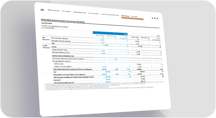 401 BMW Group Report 2024 To Our Stakeholders Combined Management Report Group Financial Statements Responsibility Statement and Auditor’s Report Remuneration Report Other Information II. Remuneration of the Members of the Board of Management Remuneration granted and owed in financial year 2024 (2023) ILKA HORSTMEIER Human Resources and Real Estate, Labour Director since 1 November 2019 FY 2024 FY 2023 Vesting year 2024 in € Earlier vesting years in € as a % of total remuneration Vesting year 2023 in € Earlier vesting years in € as a % of total remuneration Fixed remuneration Fixed remuneration (base salary) 1,050,000 – 40 1,050,000 – 24 Fringe benefits (other remuneration) 65,693 – 2 66,981 – 2 Total 1,115,693 42 1,116,981 25 Variable remuneration B O N U S Earnings component of bonus 522,675 – 20 966,000 – 22 Performance component of bonus 569,250 – 21 586,500 – 13 S H A R E - B A S E D R E M U N E R A T I O N Share-based remuneration component (matching component) – 26,8711 1 – – – Personal cash investment amount2 RoCE component – – – 1,068,800 – 24 Strategic focus target component 416,000 – 16 675,200 – 15 Total variable remuneration for vesting year 2024 or earlier vesting years 1,507,925 26,871 57 or 1 3,296,500 – 75 or 0 Total 1,534,796 58 3,296,500 75 Remuneration for vesting year 2024 or earlier vesting years 2,623,618 26,871 99 or 1 4,413,481 – 100 or 0 Total remuneration according to § 162 German Stock Corporation Act (AktG) 2,650,489 100 4,413,481 100 Service cost3 406,415 407,533 Total remuneration plus service cost4 3,056,904 4,821,014 1 The number of shares purchased in 2020 with the 2019 cash remuneration component (investment component) for the financial year amounted to 782. The number of mathematical matching shares for calculating the cash equivalent amounts to 260. 2 Assessment period five years in total: One year for determining the personal cash investment amount, a four-year holding obligation for the shares acquired with the payout amount. 3 The service cost in accordance with IAS 19 represents the expense for the company; this amount is not paid out to the Board of Management member. 4 For the purposes of compliance with the maximum specified remuneration limit, only the service cost and the remuneration for the vesting year are to be taken into account. See table ↗ Maximum remuneration and remuneration vested in the 2024 financial year (vesting year).