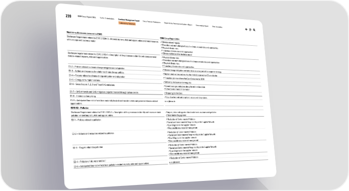 239 BMW Group Report 2024 To Our Stakeholders Combined Management Report Group Financial Statements Responsibility Statement and Auditor’s Report Remuneration Report Other Information Sustainability Statement Mandatory discosures pursuant to ESRS BMW Group Report 2024 Disclosure Requirement related to ESRS 2 SBM-3 – Material impacts, risks and opportunities and their interaction with strategy and business model ↗ Climate-related impacts ↗ Procedure and methodological basis for climate-related risks and opportunities ↗ Physical climate risks ↗ Transitory climate risks and opportunities ↗ Climate resilience of the business model Disclosure requirement related to ESRS 2 IRO-1 – Description of the processes to identify and assess material climate-related impacts, risks and opportunities ↗ Physical climate risks ↗ Procedure and methodological basis for climate-related risks and opportunities ↗ Physical climate risks ↗ Transitory climate risks and opportunities E1-2 – Policies related to climate change mitigation and adaptation ↗ Climate change mitigation and adaptation as a key part of the corporate strategy E1-3 – Actions and resources in relation to climate change policies ↗ Implemented actions and metrics for a holistic approach to CO2e reduction E1-4 – Targets related to climate change mitigation and adaptation ↗ Transition plan to achieve Net Zero Emissions by 2050 E1-5 – Energy consumption and mix ↗ Efficiency measures and energy mix E1-6 – Gross Scopes 1, 2, 3 and Total GHG emissions ↗ Greenhouse gas emissions along the entire value chain ↗ Other Environmental Information E1-7 – GHG removals and GHG mitigation projects financed through carbon credits ↗ Preparing for Net Zero E1-8 – Internal carbon pricing ↗ Use of an internal carbon price to assess vehicle projects E1-9 – Anticipated financial effects from material physical and transition risks and potential climate-related opportunities n. a./phase-in ESRS E2 – Pollution Disclosure Requirement related to ESRS 2 IRO-1 – Description of the processes to identify and assess material pollution-related impacts, risks and opportunities ↗ Impact, risks and opportunities in relation to environmental pollution ↗ Stakeholder Engagement E2-1 – Policies related to pollution ↗ Reduction of Environmental Pollution ↗ Social and Environmental Responsibility in the Supplier Network ↗ Due Diligence in the supplier network ↗ Responsible raw material management E2-2 – Actions and resources related to pollution ↗ Reduction of Environmental Pollution ↗ Social and Environmental Responsibility in the Supplier Network ↗ Due Diligence in the supplier network ↗ Responsible raw material management E2-3 – Targets related to pollution ↗ Reduction of Environmental Pollution ↗ Social and Environmental Responsibility in the Supplier Network ↗ Due Diligence in the supplier network ↗ Responsible raw material management E2-4 – Pollution of air, water and soil ↗ Reduction of Environmental Pollution E2-6 – Anticipated financial effects from pollution-related impacts, risks and opportunities n. a./phase-in