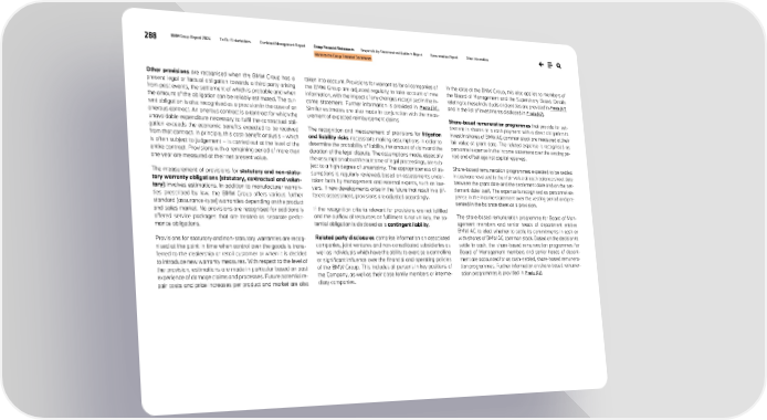 288 BMW Group Report 2024 To Our Stakeholders Combined Management Report Group Financial Statements Responsibility Statement and Auditor’s Report Remuneration Report Other Information Notes to the Group Financial Statements Other provisions are recognised when the BMW Group has a present legal or factual obligation towards a third party arising from past events, the settlement of which is probable and when the amount of the obligation can be reliably estimated. The cur- rent obligation is also recognised as a provision in the case of an onerous contract. An onerous contract is a contract for which the unavoidable expenditure necessary to fulfil the contractual obli- gation exceeds the economic benefits expected to be received from that contract. In principle, this cost-benefit analysis – which is often subject to judgement – is carried out at the level of the entire contract. Provisions with a remaining period of more than one year are measured at their net present value. The measurement of provisions for statutory and non-statu- tory warranty obligations (statutory, contractual and volun- tary) involves estimations. In addition to manufacturer warran- ties prescribed by law, the BMW Group offers various further standard (assurance-type) warranties depending on the product and sales market. No provisions are recognised for additionally offered service packages that are treated as separate perfor- mance obligations. Provisions for statutory and non-statutory warranties are recog- nised at the point in time when control over the goods is trans- ferred to the dealership or retail customer or when it is decided to introduce new warranty measures. With respect to the level of the provision, estimations are made in particular based on past experience of damage claims and processes. Future potential re- pair costs and price increases per product and market are also taken into account. Provisions for warranties for all companies of the BMW Group are adjusted regularly to take account of new information, with the impact of any changes recognised in the in- come statement. Further information is provided in ↗ note [34]. Similar estimates are also made in conjunction with the meas- urement of expected reimbursement claims. The recognition and measurement of provisions for litigation and liability risks necessitate making assumptions in order to determine the probability of liability, the amount of claim and the duration of the legal dispute. The assumptions made, especially the assumption about the outcome of legal proceedings, are sub- ject to a high degree of uncertainty. The appropriateness of as- sumptions is regularly reviewed, based on assessments under- taken both by management and external experts, such as law- yers. If new developments arise in the future that result in a dif- ferent assessment, provisions are adjusted accordingly. If the recognition criteria relevant for provisions are not fulfilled and the outflow of resources on fulfilment is not unlikely, the po- tential obligation is disclosed as a contingent liability. Related party disclosures comprise information on associated companies, joint ventures and non-consolidated subsidiaries as well as individuals which have the ability to exercise a controlling or significant influence over the financial and operating policies of the BMW Group. This includes all persons in key positions of the Company, as well as their close family members or interme- diary companies. In the case of the BMW Group, this also applies to members of the Board of Management and the Supervisory Board. Details relating to these individuals and entities are provided in ↗ note [41] and in the list of investments disclosed in ↗ note [47]. Share-based remuneration programmes that provide for set- tlement in shares or a cash payment with a direct obligation to invest in shares of BMW AG common stock are measured at their fair value at grant date. The related expense is recognised as personnel expense in the income statement over the vesting pe- riod and offset against capital reserves. Share-based remuneration programmes expected to be settled in cash are revalued to their fair value at each balance sheet date between the grant date and the settlement date and on the set- tlement date itself. The expense is recognised as personnel ex- pense in the income statement over the vesting period and pre- sented in the balance sheet as a provision. The share-based remuneration programme for Board of Man- agement members and senior heads of department entitles BMW AG to elect whether to settle its commitments in cash or with shares of BMW AG common stock. Based on the decision to settle in cash, the share-based remuneration programmes for Board of Management members and senior heads of depart- ment are accounted for as cash-settled, share-based remunera- tion programmes. Further information on share-based remuner- ation programmes is provided in ↗ note [42].