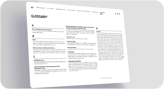 427 BMW Group Report 2024 To Our Stakeholders Combined Management Report Group Financial Statements Responsibility Statement and Auditor’s Report Remuneration Report Other Information Glossary A Asset-backed financing transactions A form of corporate financing involving the sale of receivables to a financing company. B Bond A securitised debt instrument in which the issuer certifies its ob- ligation to repay the nominal amount at the end of a fixed term and to pay a fixed or variable rate of interest. Business volume in balance sheet terms The sum of the balance sheet line items “Leased products” and “Receivables from sales financing” (current and non-current), as reported in the balance sheet for the Financial Services segment. C Capitalisation rate Capitalised development costs as a percentage of research and development expenditure. Capital expenditure ratio (excluding capitalised development costs) Investments in property, plant and equipment and other intangi- ble assets (excluding capitalised development costs) as a per- centage of Group revenues. Capital expenditure ratio (excluding right-of-use assets and excluding capitalised development costs) Investments in property, plant and equipment (excluding right- of-use assets in accordance with IFRS 16) and other intangible assets (excluding capitalised development costs) as a percent- age of Group revenues. Cash flow at risk Similar to “value at risk” (see definition below). Cash flow hedges Hedges against exposures to the variability in forecasted cash flows, particularly in connection with exchange rate fluctuations. Commercial paper Deep-discounted bonds with a term of less than one year. Consolidation The process of consolidating separate financial statements of Group entities into Group Financial Statements, depicting the fi- nancial position, net assets and results of operations of the Group as a single economic entity. Credit default swap (CDS) Financial swap agreements, under which creditors of securities (usually bonds) pay premiums to the seller of the CDS to hedge against the risk that the issuer of the bond will default. As with credit default insurance agreements, the party receiving the pre- miums gives a commitment to compensate the bond creditor in the event of default. D Deliveries A new or used vehicle will be recorded as a delivery once handed over to the end user. End users also include leaseholders under lease contracts with BMW Financial Services and – in the US and Canada – dealerships when they designate a vehicle as a service loaner or demonstrator vehicle. In the case of used vehicles, end users may include dealerships and other third parties when they purchase a vehicle at auction or directly from the BMW Group. Vehicles designated for the end user which suffer a total loss in transit are also recorded as deliveries. Deliveries may be made by BMW AG, one of its international subsidiaries, a BMW Group retail outlet, an agent, or independent dealerships. The vast ma- jority of deliveries – and hence the reporting to BMW Group of deliveries – are made by independent dealerships. In the US and Canada, the period start and end dates for the reporting of deliv- eries deviate immaterially from the beginning and, respectively, end of calendar years or calendar quarters and instead follow in- dustry-standard reporting calendars. In the German-language version of the BMW Group Report, the terms “Auslieferungen” (deliveries) and “Absatz” (sales) are used interchangeably. * Part of the Combined Management Report. GLOSSARY*