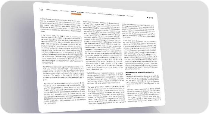 122 BMW Group Report 2024 To Our Stakeholders Combined Management Report Group Financial Statements Responsibility Statement and Auditor’s Report Remuneration Report Other Information Sustainability Statement This significantly reduces CO2e emissions, even if it increases electricity consumption. The plant in Debrecen sources all of its production-related electricity needs from electricity from renew- able sources. These decarbonisation levers are helping the BMW Group to achieve its overall targets in a manner which is proportionate to the total volume of emissions allocated to each scope. In the supply chain, the biggest lever for CO2e-reducing measures is the use of electricity from renewable sources, while the second biggest lever is the use of secondary materials and raw materials from CO2e-reduced production processes (for ex- ample steel and aluminium). Expanded innovation and infra- structure management process for logistics measures are reduc- ing emissions related to logistics. During the use phase, the big- gest lever is the electrification of the product portfolio across all brands. In addition, other drive technologies such as hydrogen are being further developed and will be gradually integrated into the product range. The BMW Group is also implementing effi- ciency improvements for conventional drivetrains and continu- ously increasing the use of electricity from CO2e-free sources for vehicle charging. The BMW Group expects the largest contribution to achieving the 2030 CO2e emissions reduction target – approximately 65% in absolute terms – to come from the electrification of the vehicle fleet (automobiles), which is allocated to the Scope 3 category Use phase. The majority of the remaining reductions will be achieved by implementing measures in the supply chain and lo- gistics. The LCA (Life Cycle Assessment) comparison of current all-elec- tric vehicles shows improvements that have already been real- ised. The next generation of battery technology in the NEUE KLASSE vehicles is expected to reduce emissions in the supply chain for the battery cell approximately by another third. By using electricity from renewable sources in selected process steps, CO2e emissions can be reduced further over the entire life cycle. Compared to comparable vehicle concepts with an internal com- bustion engine, Scope 3 CO2e emissions can be reduced by up to three quarters. Regardless of the drivetrain technology, the decarbonisation of the supply chain in particular makes significant contributions to achieving the target. The continuously growing proportion of electric vehicles in the BMW Group’s range may cause emissions in the supply chain to increase in the short to medium term. The main reason for this is the higher product carbon footprint (PCF) of the high-voltage battery compared to conventional drivetrain concepts. In the supply chain and in the component manufactur- ing process, the BMW Group therefore relies on electricity from renewable sources at selected stages of the process, in addition to using recycled materials and technical measures that have been developed to limit the increase in CO2e in the supply chain. High reduction contributions result from agreements with raw material suppliers for aluminium and precious metals as well as from suppliers of high-voltage battery cells. These measures are already being implemented with the current battery generation. With the use of upcoming battery generations, these effects are to be further expanded. For example, by using materials with CO2e-reduced manufacturing processes or higher proportions of recyclates, CO2e emissions can be reduced by up to 80% for al- uminium and up to 70% for steel. This includes the use of direct reduction processes in steel production. For other material groups such as glass and plastics, the use of electricity from re- newable sources has a particularly beneficial effect on the CO2e footprint of the supply chain. The BMW Group takes into account the trends in key customer segments, drivetrain technologies, and forecasts for the decar- bonisation of supply chains and energy generation when opera- tionalising emission targets across all three scopes. CO2e credits (certificates) are not factored in when these targets are set and monitored - Only actual reduction measures are counted. The target achievement is subject to uncertainties, some of which cannot partially or cannot be completely influenced by the BMW Group. For example, future deliveries of battery electric ve- hicles (BEV) as a proportion of total sales may not be in line with current assumptions. The availability of appropriate infrastruc- ture and incentives to purchase BEVs will have an impact on de- mand. It became clear in the reporting year that the BEV market remains fragmented worldwide. Different markets are develop- ing at different speeds. External factors such as the removal of incentives are having a significant impact. The flexibility of the BMW Group’s production network puts it in a position to react ef- fectively to these developments. Higher overall sales volumes or a higher proportion of combustion-engine vehicles would make additional supply chain decarbonisation measures necessary in order to achieve the CO2e targets. Geopolitical risks can also have a significant impact on the BMW Group’s ability to achieve climate targets. External market-specific developments in the supply chain may also lead to the decarbonisation of energy-intensive upstream stages in particular taking a different course than planned. Not all factors that impact decarbonisation can be directly influenced, particularly in the production of CO2e-intensive raw materials such as steel and aluminium and the subsequent value creation stages in the supply chain. Furthermore, the ambitious forecasts of the International Energy Agency (IEA) – which are used to cal- culate emissions in the use phase of electrified vehicles – may be missed if, for exa