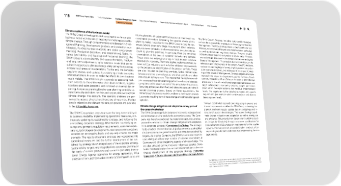 118 BMW Group Report 2024 To Our Stakeholders Combined Management Report Group Financial Statements Responsibility Statement and Auditor’s Report Remuneration Report Other Information Sustainability Statement Climate resilience of the business model The BMW Group actively works on improving the resilience of its business model with the aim of meeting the challenges posed by climate change. Through comprehensive consideration in Strat- egy and Planning, Development (products and production tech- nologies), Purchasing (raw materials and global procurement markets), Production (locations and cooperations), Sales, Fi- nance (profitability and liquidity) and Personnel (training), the BMW Group is able to identify and assess the short-, medium- and long-term adjustments to its business model that are re- quired in response to climate change while taking the necessary actions in all areas of its operations. To this end, the Company regularly reviews and updates its underlying climate scenarios and assumptions in order to make the effects its own business model visible. The BMW Group’s approach to assessing resili- ence extends to the entire value chain (own locations, supplier locations and sales locations) and is based on internal risk re- porting. Corporate planning (twelve-year planning period) is up- dated annually and takes the risks and opportunities arising from climate change into account. The scenario analyses are per- formed to assess physical and transitory climate risks. Further details related to the climate risk analysis process are available in the ↗ Materiality Assessment. The BMW Group takes steps to ensure the long-term viability of its business model by implementing operational measures, con- tinuously updating its sustainability strategy, and following the overarching corporate strategy. Uncertainties in underlying as- sumptions (primarily regulatory requirements, customer expec- tations, technological developments, macroeconomic trends) are recorded on an ongoing basis and any adjustments are made promptly. The results of scenario analyses are incorporated into operational measures and the further development of the sus- tainability strategy as an integral part of the corporate strategy. Sustainability targets are integrated into corporate planning on the basis of current premises and scenarios (including Interna- tional Energy Agency scenarios for energy generation, CO2e emissions from upstream value creation). Starting with sales and volume planning, all subsequent processes are interlinked in a coordinated procedure. Simulating the possible effects of this planning makes it possible for the BMW Group to take the nec- essary actions at an early stage. Assumptions about technolo- gies, customer behaviour and demand trends are taken into ac- count as planning premises. In particular, there are remaining uncertainties in the area of customer behavior and demand. These areas are reviewed on a regular basis in order to reduce this level of uncertainty. The same applies to planned actions re- lated to CO2e reduction, such as further efficiency improvements or the progressive electrification of the product portfolio. These are also included as planning premises. Global market sales forecasts and the planned product and drive portfolio are taken into account as key factors. This means that the resilience anal- ysis assesses the entire planning period based on the latest as- sumptions and forecasts as part of the annual planning process. Resulting actions are identified and taken into account in the fi- nancial planning process. Based on these assumptions, the BMW Group's business model is resilient to the impacts and ad- justments resulting from climate change and climate change ad- aptation. Climate change mitigation and adaptation as key parts of the corporate strategy The BMW Group regards its balance of economic, ecological and social interests as the basis for its economic success. The Com- pany has therefore anchored the material impacts, risks and op- portunities related to climate change mitigation and adaptation in its corporate strategy ↗ Cornerstones of the Strategy. The strategic fields of action of electrification, digitalisation and sustainability/ circular economy are geared towards achieving the sustainability targets. As a global Company, the BMW Group is also in contin- uous dialogue with a large number of external stakeholders in Germany and abroad regarding aspects of climate change. This includes affected communities and indigenous peoples. Stake- holder feedback is taken into account and contributes to the con- tinuous development of the corporate strategy ↗ Stakeholder Engagement, ↗ Social and Environmental Responsibility in the Supply Network. The BMW Group’s Strategy, including topic-specific strategies such as the sustainability strategy, is confirmed by the Board of Management. The CO2e strategy draws on the Greenhouse Gas Protocol, science-based targets and implementation pathways, as well as all relevant regulatory changes. Progress towards achieving these targets is reviewed on a regular basis. All neces- sary actions are discussed in the relevant committees and by the Board of Management. These bodies also reach decisions on the relevance and effectiveness of the actions. Specific decisions, such as overarching targets for reducing CO2e emissions and cir- cular economy initiatives, are addressed in topic-specific meet- ings of the Board of Management. Strategic aspects are imple- mented in the respective departments such as Purchase, Devel- opment, Production, HR and Sales on the basis of defined target processes. In line with established target-setting processes and target achievement monitoring systems, targets are broken down within the organisation to the individual implementation levels. The targets are further detailed as needed with specific requirements (for example within vehicle projects and down to the component level). Taki