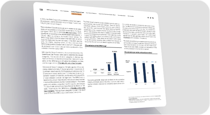 124 BMW Group Report 2024 To Our Stakeholders Combined Management Report Group Financial Statements Responsibility Statement and Auditor’s Report Remuneration Report Other Information Sustainability Statement In 2024, the BMW Group’s CO2e emissions, excluding biogenic CO2 emissions, totalled 836,963 t CO2e in Scope 1 and 2 and 130,297,238 t CO2e in Scope 3. These absolute CO2e emissions are set in relation to net sales revenue in accordance with the ESRS requirements. For the re- porting year 2024, this so called ↗ Greenhouse gas intensity is 933 t CO2e/€ million according to the market-based method and 941 t CO2e/€ million according to the location-based method. The BMW Group expects that the targets that have been set will re- duce this figure over the next few years. In the 2024 reporting year, the relative reporting metrics for CO2e emissions from BMW Group locations (Scope 1 and 2) are 0.27 t CO2e per vehi- cle produced,1 and 13.55 t CO2e per vehicle produced for CO2e emissions from the supply chain.1 With regard to Scope 3 emissions, the assessment criteria of the Greenhouse Gas Protocol were used to determine the relevant categories. The decision of which categories to disclose was made on the basis of volumes and proportion, measurability, the ability of the BMW Group to influence the emissions volumes, and the degree of risk. ↗ Materiality of the various Scope 3 categories Emissions in Scope 3 categories 2 (Capital goods), 3 (Fuel and energy-related activities), 5 (Waste generated in operations), 8 (Upstream leased assets), 10 (Processing of sold products), 13 (Downstream leased assets) and 15 (Investments) are not re- ported for reasons of materiality, as they account for around 3% of total emissions and are not significant. The BMW Group is therefore focusing on the emissions that are considered relevant in terms of the absolute volumes involved (category 1, Purchased goods and services, categories 4 and 9, Logistics, and category 11, Use of sold products) and those that can be directly or indi- rectly influenced by the BMW Group ↗ Materiality of the various Scope 3 categories. The significant categories included in the report cover 97% of the BMW Group’s total Scope 3 emissions. The BMW Group's greenhouse gas emissions are calculated us- ing recognised data sources and methods. These include the specialised software LCA for Experts, which is used to analyse the value chain and calculate the Global Warming Potential (GWP) values of the Intergovernmental Panel on Climate Change (IPCC). Until reliable primary data is available, for example based on emission measurements performed in the supply chain by the suppliers themselves, values from databases are used instead of primary data (0%). These values are adjusted in certain cases using more precise secondary data, provided that measures to reduce the CO2e emissions of relevant suppliers are verifiable. CO2e emissions of the BMW Group2 in t Developing generally recognised standards for the automotive industry, and ideally across industries, is a crucial step in ensur- ing that emissions data can be compared properly across com- panies. It is currently not possible to compare this data across compa- nies. The BMW Group has a long-term objective of developing a CO2e accounting system based on real data. The first steps have already been taken with the Catena-X project. Information about the system boundaries (upstream and downstream value chain), information on evaluation using market- and location-based methods and the data gathering methods can be found in the ↗ CO2e footprint and is explained in the glossary. The metrics for the Motorcycles segment were included in the re- porting metrics for Scope 3 supply chain (upstream) and the use phase (downstream) for the first time in the 2024 financial year. These values were initially collected as an extrapolation in line with the processes for the Automotive segment. CO2e emissions per vehicle produced (automotive)1 in t 1 Assurance level: reasonable assurance. Additional information is available in ↗ Glossary and Ex- planation of Key Figures. 2 Scope 2 emissions according to the market-based method. According to the location-based method, the Scope 2 emissions amount to 1,304,971 t CO2e. Additional information is available in ↗ Glossary and Explanation of Key Figures. 672,542 164,421 35,103,222 95,194,016 Scope 1 Scope 2 Scope 3 Upstream Scope 3 Downstream 0 13.55 13.91 13.13 0.27 0.28 0.40 0 2024 2023 2019 BMW Group locations Supply Chain