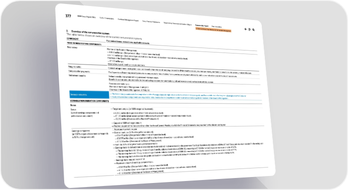 377 BMW Group Report 2024 To Our Stakeholders Combined Management Report Group Financial Statements Responsibility Statement and Auditor’s Report Remuneration Report Other Information II. Remuneration of the Members of the board of Management 2. Overview of the remuneration system The table below shows an overview of the current remuneration system. COMPONENT Parameters/measurement base, applicable amounts FIXED REMUNERATION COMPONENTS Base salary Member of the Board of Management: — € 0.90 million p.a. (first period of office = first remuneration level) — € 1.05 million p.a. (from second period of office or fourth year of mandate = second remuneration level) Chairman of the Board of Management: — € 1.95 million p.a. Base salary is paid monthly on a pro rata basis Fringe benefits Contractual agreement, main points: non-cash benefits from the use of company cars and the BMW chauffeur service, insurance premiums, contributions towards security systems, employee discounts Compensation payments The Supervisory Board may award payments to compensate for loss of salary from a previous employment relationship and to cover relocation costs in the case of new entrants Retirement benefits Defined contribution system with a guaranteed minimum return Benefits based on amounts credited to individual savings accounts for contributions paid and interest earned, various forms of disbursement Pension contribution p.a.: Member of the Board of Management: € 400,000 Chairman of the Board of Management: € 700,000 Strategic relevance — The base salary counteracts the temptation to take disproportionately high risks in order to achieve short-term goals, and thus contributes to the long-term development of the Company — Fixed remuneration components are required for remuneration to be competitive in order to attract and retain qualified members of the Board of Management VARIABLE REMUNERATION COMPONENTS Bonus Bonus (sum of earnings component and performance component) — Target amount p.a. (at 100% target achievement): — € 0.95 million (first period of office = first remuneration level) — € 1.15 million (from second period of office or fourth year of mandate = second remuneration level) — € 2.10 million (Chairman of the Board of Management) — Capped at 180% of target amount — Payment as part of the next payroll run after the Annual General Meeting at which the Financial Statements are presented for the relevant vesting year Earnings component (at 100% target achievement corresponds to 50% of target amount) — Assessment period one year — Base amount p.a. (50% of target bonus amount): — € 0.475 million (first period of office = first remuneration level) — € 0.575 million (from second period of office or fourth year of mandate = second remuneration level) — € 1.050 million (Chairman of the Board of Management) — Formula: 50% of target amount x performance factor — Earnings factor is derived from an allocation matrix determined in advance based on the parameters “profit attributable to shareholders of BMW AG” and “Group post-tax return on sales” in the vesting year — The earnings factor is 1.0 e.g. in case of a profit attributable to shareholders of BMW AG amounting to € 7.0 billion and a Group post-tax return on sales of 6.0% — The earnings factor is 1.5 e.g. in case of a profit attributable to shareholders of BMW AG amounting to € 8.6 billion and a Group post-tax return on sales of 7.7% — The earnings factor is 0 in case of a profit attributable to shareholders of BMW AG below € 4.0 billion and/or a Group post-tax return on sales of below 3.2% — Earnings factor may not exceed 1.8 — Maximum amount of earnings component p.a.: — € 0.855 million (first period of office = first remuneration level) — € 1.035 million (from second period of office or fourth year of mandate = second remuneration level) — € 1.890 million (Chairman of the Board of Management)