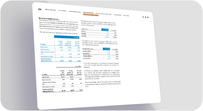 334 BMW Group Report 2024 To Our Stakeholders Combined Management Report Group Financial Statements Responsibility Statement and Auditor’s Report Remuneration Report Other Information Notes to the Group Financial Statements Disclosures on hedging measures The following disclosures on hedging measures include deriva- tives of fully consolidated companies that are designated as a hedging instrument. The amounts shown in the table are stated before deferred taxes and take account of additional effects aris- ing from the application of the modified closing rate method. The nominal amounts of hedging instruments were as follows: 31.12.2024 in € million Maturity within one year Maturity between one and five years Maturity later than five years Currency risks 15,804 18,452 283 Interest rate risks 7,299 18,614 8,232 Combined interest/currency risks – 4,759 4,045 Raw material price risks 3,236 4,466 – Nominal amounts of hedging instruments 26,339 46,291 12,560 31.12.2023 in € million Maturity within one year Maturity between one and five years Maturity later than five years Currency risks 22,648 18,328 – Interest rate risks 7,055 19,169 8,626 Combined interest/currency risks 908 961 791 Raw material price risks 3,519 5,329 – Nominal amounts of hedging instruments 34,130 43,787 9,417 The following table shows the average hedging rates of the fi- nancial instruments used by the BMW Group to hedge significant currency risk exposures: Currency risks 31.12.2024 31.12.2023 EUR/CNY 7.37 7.40 EUR/GBP 0.89 0.87 EUR/KRW 1,453.03 1,405.05 The following table shows the average hedging rates of the fi- nancial instruments used by the BMW Group to hedge significant raw materials risk exposures: Raw material price risks 31.12.2024 31.12.2023 Aluminium (EUR/t) 2,427 2,270 Copper (EUR/t) 8,201 7,398 Palladium (EUR/oz) 1,264 1,465 Lithium (EUR/t) 22,127 29,726 Due to the concentration on significant raw materials risk expo- sures, nickel no longer represents a significant raw materials risk exposure. Information on average interest hedge rates is not provided, since interest rate derivatives designated as hedging instru- ments are used exclusively to hedge items in fair value hedges. The hedge rates therefore correspond in each case to the current market interest rate level. Most of the hedges used in this context relate to variable yield curves relating to the euro, US dollar and British pound currency areas.