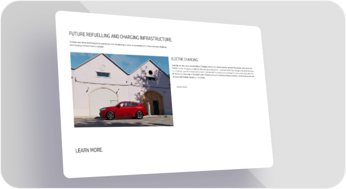 To keep new drive technologies for passenger cars developing at pace, an extensive and comprehensive refuelling and charging infrastructure is needed. FUTURE REFUELLING AND CHARGING INFRASTRUCTURE. ELECTRIC CHARGING. Over the last few years, the number of charging stations for battery electric vehicles has soared, with more than 75,000 normal chargers available to the German public alone – and over 15,000 fast-chargers. By 2030 the num- ber of charging points is expected to reach a million, offering widespread coverage in urban areas especially. The BMW Group is focusing on expanding the infrastructure and increasing charging speeds, and developing services for customer-friendly charging – anywhere. LEARN MORE LEARN MORE.