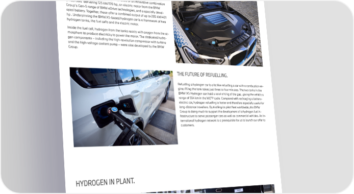 A NEW LEVEL OF PARTNERSHIP. A core component of the BMW iX5 Hydrogen is the fuel-cell system, which offers consistently high output of 125 kW/170 hp. The individual cells are manufactured for the BMW Group by the Toyota Motor Corporation. In September 2024 the BMW Group and Toyota Motor Corporation take col- laboration to the next level. Both companies are pooling their innovative strength and their technological capabilities to bring a new generation of fuel cell powertrain technology to the roads. TECHNOLOGY DRIVES INNOVATION. The drive of the BMW iX5 Hydrogen consists of an innovative combination of fuel cells delivering 125 kW/170 hp, an electric motor from the BMW Group’s Gen-5 range of BMW eDrive technologies, and a specially devel- oped battery. Together, these offer a combined output of up to 285 kW/401 hp . Underpinning the BMW X5-based hydrogen car is a framework of two hydrogen tanks, the fuel cells and the electric motor. Inside the fuel cell, hydrogen from the tanks reacts with oxygen from the at- mosphere to produce electricity to power the motor. The dedicated hydro- gen components – including the high-revolution compressor with turbine and the high-voltage coolant pump – were also developed by the BMW Group. THE FUTURE OF REFUELLING. Refuelling a hydrogen car is a lot like refuelling a car with a combustion en- gine: filling the tank takes just three to four minutes. The two tanks in the BMW iX5 Hydrogen can hold a total of 6 kg of the gas , giving the vehicle a range of 504 km in the WLTP cycle. Compared with recharging a battery- electric car, hydrogen refuelling is faster and therefore especially useful for long-distance travellers. By trialling its pilot fleet worldwide, the BMW Group is doing much to support the development of a hydrogen fuel in- frastructure to serve passenger cars as well as commercial vehicles. An in- ternational hydrogen network is a prerequisite for us to launch our offer to customers. HYDROGEN IN PLANT.