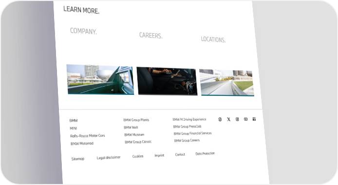 BMW MINI Rolls-Royce Motor Cars BMW Motorrad BMW Group Plants BMW Welt BMW Museum BMW Group Classic BMW M Driving Experience BMW Group PressClub BMW Group Financial Services BMW Group Careers Sitemap Legal disclaimer Cookies Imprint Contact Data Protection Designworks. A BMW Group subsidiary, Designworks is a globally active creative con- sultancy. With studios in North America, Europe and Asia, we have been shaping the future and experience of mobility for more than 50 years – above and beyond the realms of the automobile. Learn More LEARN MORE. COMPANY. CAREERS. LOCATIONS.