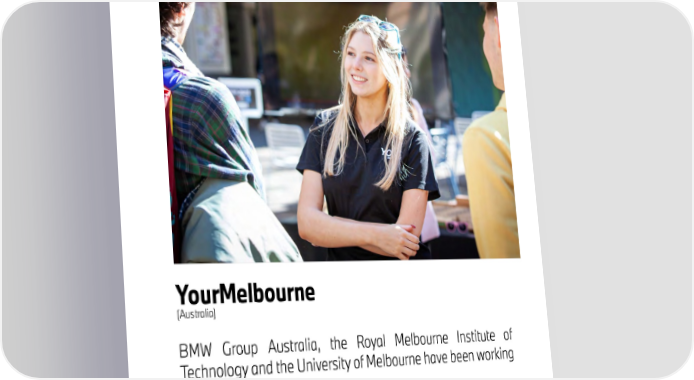 21 YourMelbourne (Australia) BMW Group Australia, the Royal Melbourne Institute of Technology and the University of Melbourne have been working together since 2020. YourMelbourne is a competition for ideas for the City of Melbourne in 2030, taking into account the 17 United Nations Sustainable Development Goals (SDGs). The focus is on mobility and quality of life in Melbourne to promote a sustainable and viable urban development, allowing local residents to get actively involved in shaping the future of their city.