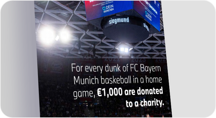 71 The BMW Group and FC Bayern Basketball have jointly supported regional education projects as part of their partnership since 2023. For every dunk of FC Bayern Munich baskeball in a home game, €1,000 are donated to a charity. 71