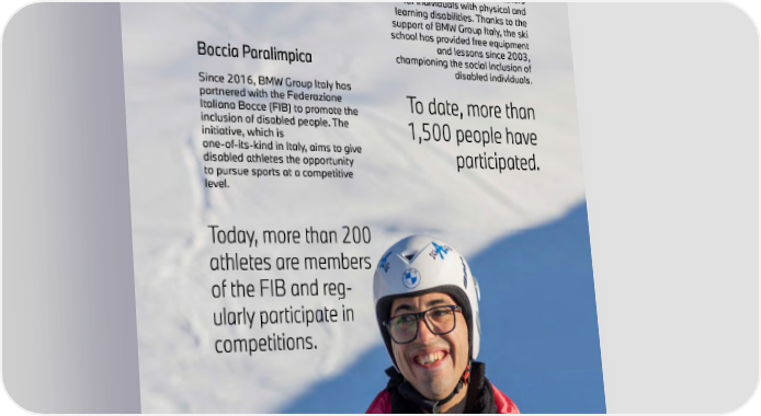 75 SciAbile The Sauze d’Oulx ski school caters for individuals with physical and learning disabilities. Thanks to the support of BMW Group Italy, the ski school has provided free equipment and lessons since 2003, championing the social inclusion of disabled individuals. Boccia Paralimpica Since 2016, BMW Group Italy has partnered with the Federazione Italiana Bocce (FIB) to promote the inclusion of disabled people. The initiative, which is one-of-its-kind in Italy, aims to give disabled athletes the opportunity to pursue sports at a competitive level. Today, more than 200 athletes are members of the FIB and reg- ularly participate in competitions. To date, more than 1,500 people have participated. 75