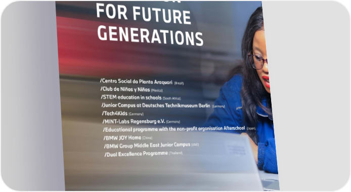 28 /Centro Social da Planta Araquari (Brazil) /Club de Niños y Niñas (Mexico) /STEM education in schools (South Africa) /Junior Campus at Deutsches Technikmuseum Berlin (Germany) /Tech4Kids (Germany) /MINT-Labs Regensburg e.V. (Germany) /Educational programme with the non-profit organisation Afterschool (Japan) /BMW JOY Home (China) /BMW Group Middle East Junior Campus (UAE) /Dual Excellence Programme (Thailand) EDUCATION FOR FUTURE GENERATIONS 28