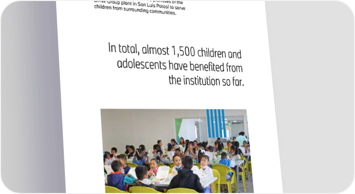 33 Since 2017, BMW Group Mexico has been supporting the NGO in creating safe spaces and educational programmes for children and adolescents from low-income families. In 2023, a centre was opened on the premises of the BMW Group plant in San Luis Potosà to serve children from surrounding communities. In total, almost 1,500 children and adolescents have benefited from the institution so far.