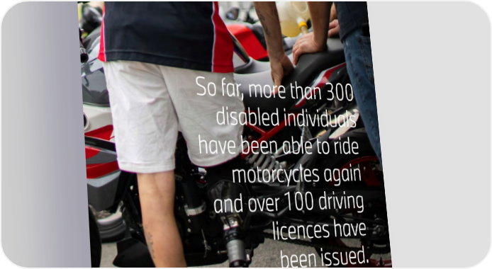 59 So far, more than 300 disabled individuals have been able to ride motorcycles again and over 100 driving licences have been issued. 59