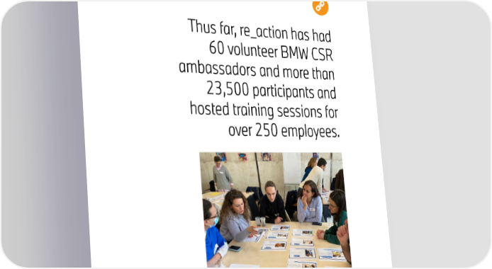 27 Thus far, re_action has had 60 volunteer BMW CSR ambassadors and more than 23,500 participants and hosted training sessions for over 250 employees. BMW Group France has been supporting the re_action programme run by the social and environmental advocacy organisation since 2022.