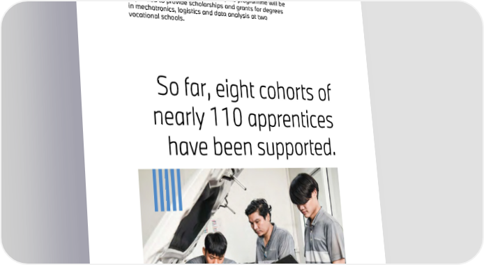 47 The two-year scholarship programme for vocational students has been ongoing since 2015. The grants are awarded for academic and practical technical training, particularly in mechatronics, at the BMW Training Centre. In the future, the programme will be expanded to provide scholarships and grants for degrees in mechatronics, logistics and data analysis at two vocational schools. So far, eight cohorts of nearly 110 apprentices have been supported.