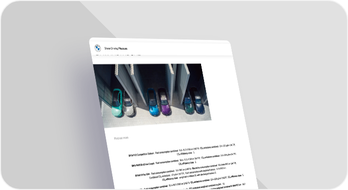 BMW M3 Competition Saloon: Fuel consumption combined 9.8–10.2 l/100 km (WLTP) CO₂ emissions combined 224–222 g/km (WLTP) CO₂ efficiency class G BMW M850i xDrive Coupé: Fuel consumption combined 10.6–10.5 l/100 km (WLTP) CO₂ emissions combined 241–239 g/km (WLTP) CO₂ efficiency class G BMW XM by Kith: Fuel consumption combined 1.9 l/100 km (WLTP) Electricity consumption combined 33.6 kWh/100 km (WLTP) Combined CO₂ emissions 43 g/km (WLTP) Fuel consumption with depleted battery 12.9 l/100 km CO₂ efficiency class weighted combined B; with discharged battery G BMW M3 CS: Fuel consumption combined 10.4–10.1 l/100 km (WLTP) CO₂ emissions combined 234–229 g/km (WLTP) CO₂ efficiency class G BMW M5 Touring [preliminary values]: CO2 emissions weighted combined in g/km 46 Fuel consumption weighted combined in l/100km 2.0; with depleted battery: 10.9 Energy consumption weighted combined in kWh/100 km 30.7 Electric range in km 61 CO2 class B; with depleted battery: G BMW M5 Saloon: Fuel consumption combined 1.9–1.6 l/100 km (WLTP) Electricity consumption combined 26.8–25.0 kWh/100 km (WLTP) CO₂ emissions combined 43–36 g/km (WLTP) Electric range 63–69 km (WLTP) Fuel consumption with depleted battery 10.7 l/100 km BMW i7 M70 xDrive: Electricity consumption combined 23.7–20.8 kWh/100 km (WLTP) CO₂ emissions combined 0 g/km Electric range 488–560 km (WLTP) CO₂ efficiency class A BMW X7 M60i xDrive: Fuel consumption combined 12.9 l/100 km (WLTP) CO₂ emissions combined 292 g/km (WLTP) CO₂ efficiency class G BMW Z4 M40i: Fuel consumption combined 8.7 l/100 km (WLTP) CO₂ emissions combined 197 g/km (WLTP) CO₂ efficiency class G BMW i4 M50 xDrive: Energy consumption combined 21,9 kWh/100 km (WLT) CO2 emissions combined 0 g/km (WLTP) CO2 class A BMW M5 Sedan with M xDrive: Energy consumption weighted combined 25.5 kWh/100 km and 1.7 l/100 km (WLTP) CO2 emissions weighted combined 39 g/km (WLTP) Fuel consumption with discharged battery 10.3 l/100 km (WLTP) CO2 classes with discharged battery G; weighted combined B BMW iX xDrive40: Electricity consumption combined 21.4–19.4 kWh/100 km (WLTP) CO₂ emissions combined 0 g/km Electric range 403–435 km (WLTP) CO₂ efficiency class A M850i xDrive Gran Coupé: Fuel consumption combined 11.0–10.7 l/100 km (WLTP) CO₂ emissions combined 251–243 g/km (WLTP) CO₂ efficiency class G BMW Skytop : Fuel consumption combined 11.6 l/100 km CO2 emissions combined 264 g/km in accordance with WLTP CO2 class G. Preliminary reference value. Pictures show the concept vehicle, details of the series may vary . BMW INDIVIDUAL Find out more MORE ARTICLES 5 min reading time Sheer Driving Pleasure